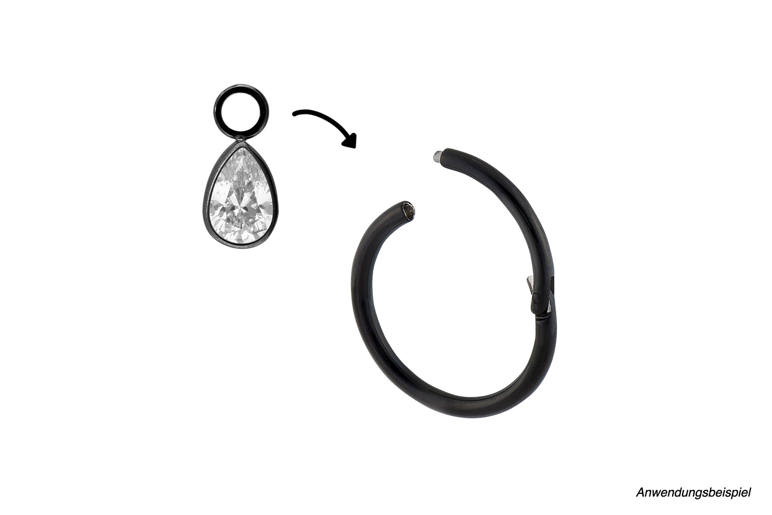 geöffnet und das Schmuckstück angebracht werden. Es besteht aus hochwertigem Titan (Grad 23) zu dessen Materialeigenschaften unter anderem gute Hautverträglichkeit und hohe Beständigkeit zählen. Hinzu kommt
