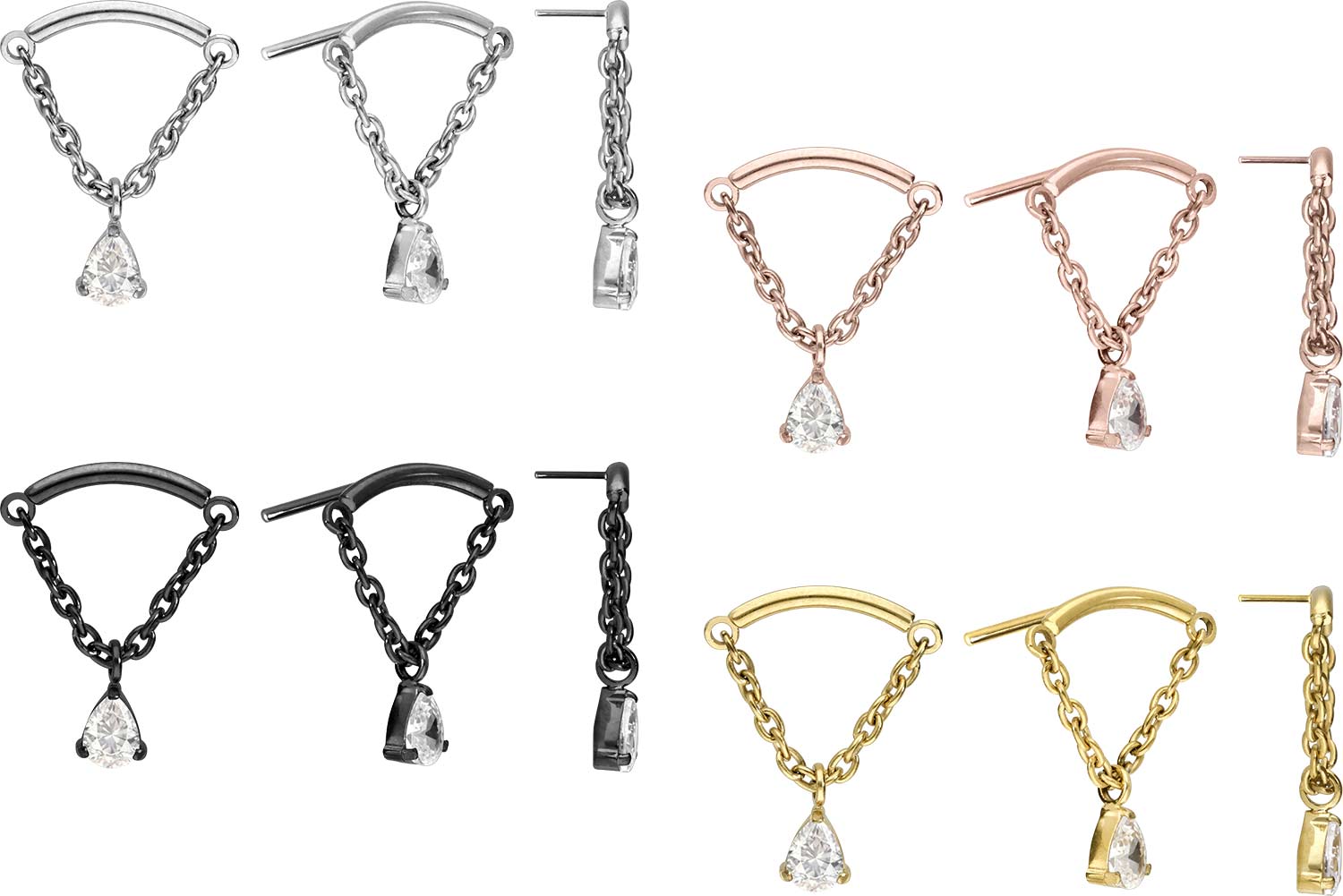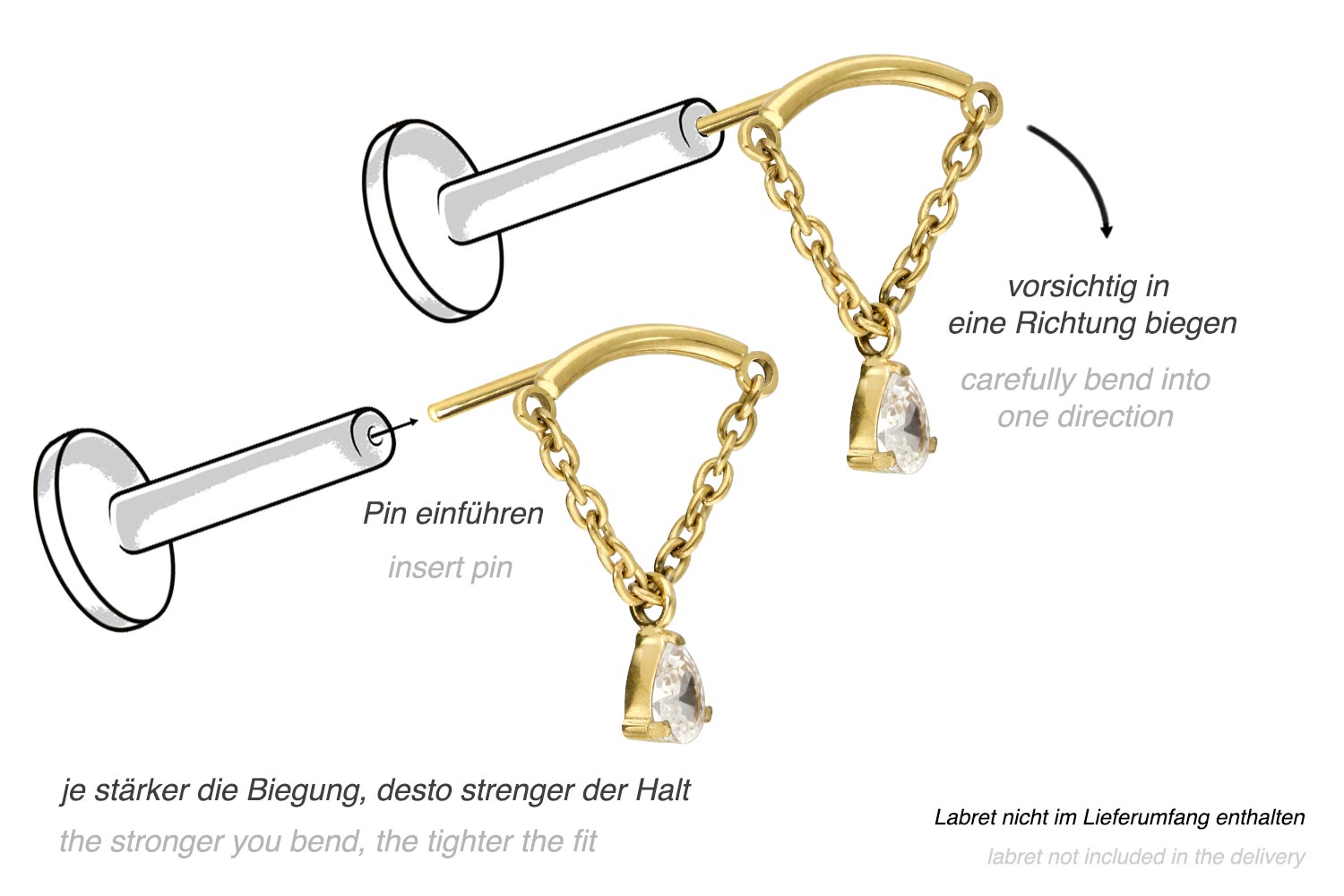 Dieser einzigartige Push Pin Aufsatz in Form eines Bogens, an welchem eine Kette mit einem beweglichen Kristalltropfen befestigt ist, wurde speziell für unsere Push Fit Piercings entwickelt und besteht aus hochwertigem Titan, das sich unter anderem