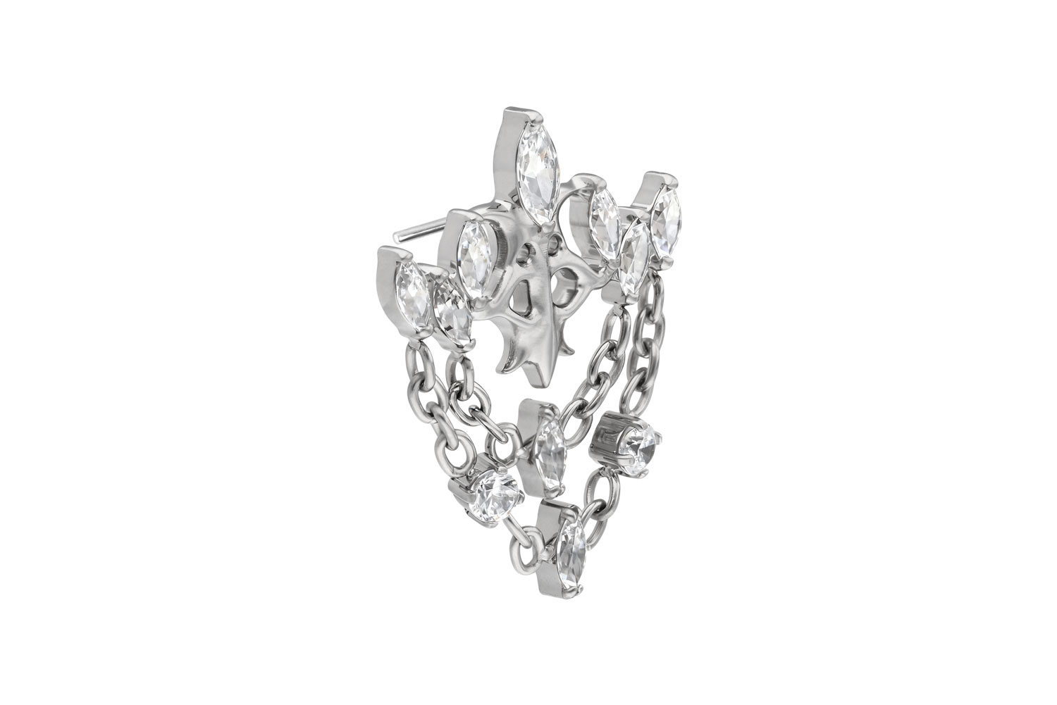 Dieser einzigartige Push Pin Aufsatz in Form einer gotischen Krone, kombiniert mit mehreren Ketten, wurde speziell für unsere Push Fit Piercings entwickelt und besteht aus hochwertigem Titan, das sich unter anderem durch gute Hautverträglichkeit und hohe Beständigkeit auszeichnet. Ebenfalls zu seinen spezifischen Materialeigenschaften gehört Farbechtheit, die sowohl bei der silberfarbenen als auch bei der schwarzen, gold- und roségoldfarbenen Variante mit PVD-Beschichtung gewährleistet wird. Zum Einsetzen muss der Pin nach Belieben gebogen werden. Es ist zu beachten, dass ein festerer Halt gewährleistet ist, wenn der Pin ein bisschen stärker gebogen wird. Darüber hinaus ist der Push Pin des Aufsatzes mit all unseren Push Fit Produkten kompatibel, sodass sich vielfältige Kombinationsmöglichkeiten ergeben.