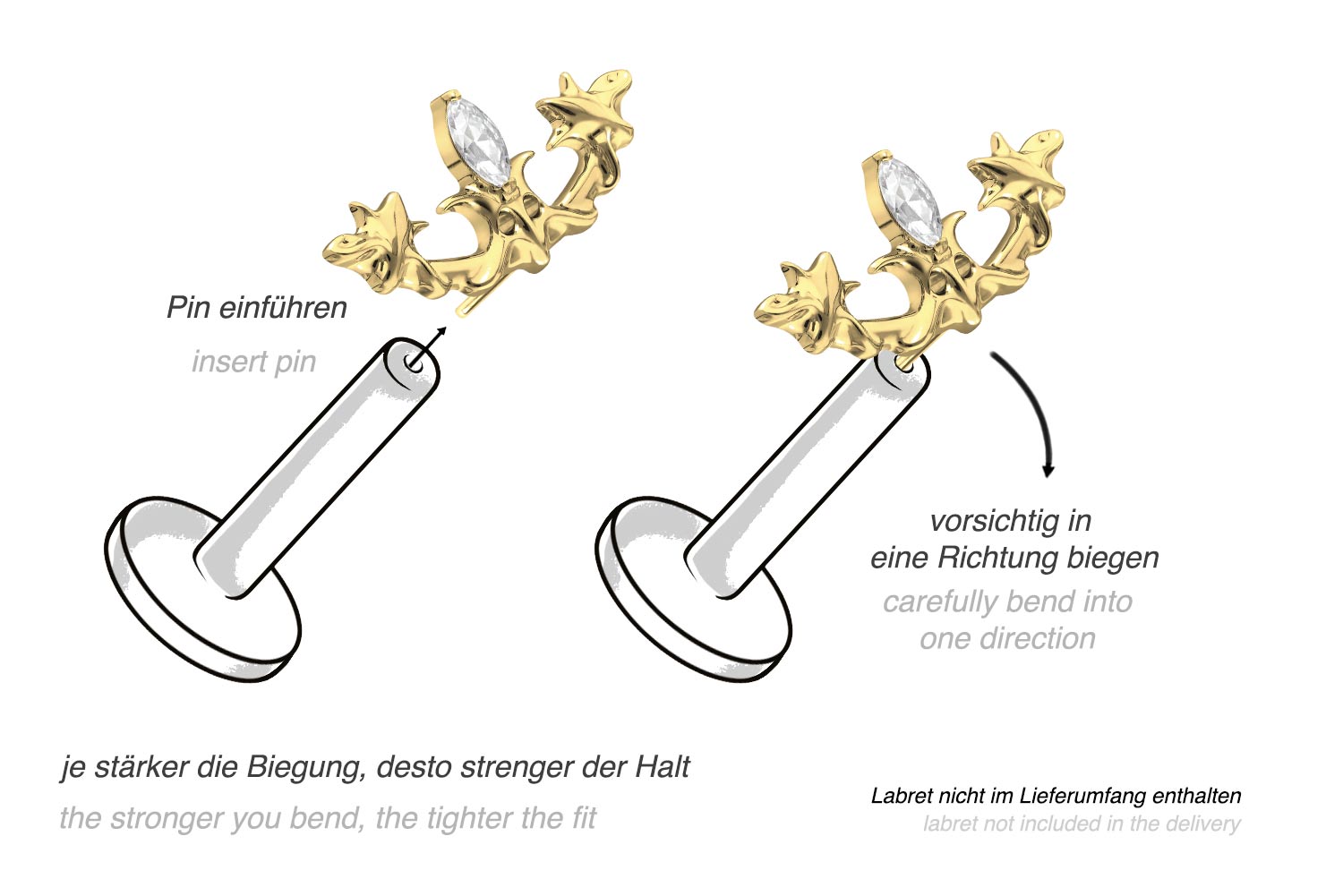 Dieser einzigartige Push Pin Aufsatz in Form eines gotischen Designs wurde speziell für unsere Push Fit Piercings entwickelt und besteht aus hochwertigem Titan, das sich unter anderem durch gute Hautverträglichkeit und hohe Beständigkeit auszeichnet. Ebenfalls zu seinen spezifischen Materialeigenschaften gehört Farbechtheit, die sowohl bei der silberfarbenen als auch bei der schwarzen, gold- und roségoldfarbenen Variante mit PVD-Beschichtung gewährleistet wird. Zum Einsetzen muss der Pin nach Belieben gebogen werden. Es ist zu beachten, dass ein festerer Halt gewährleistet ist, wenn der Pin ein bisschen stärker gebogen wird. Darüber hinaus ist der Push Pin des Aufsatzes mit all unseren Push Fit Produkten kompatibel, sodass sich vielfältige Kombinationsmöglichkeiten ergeben.