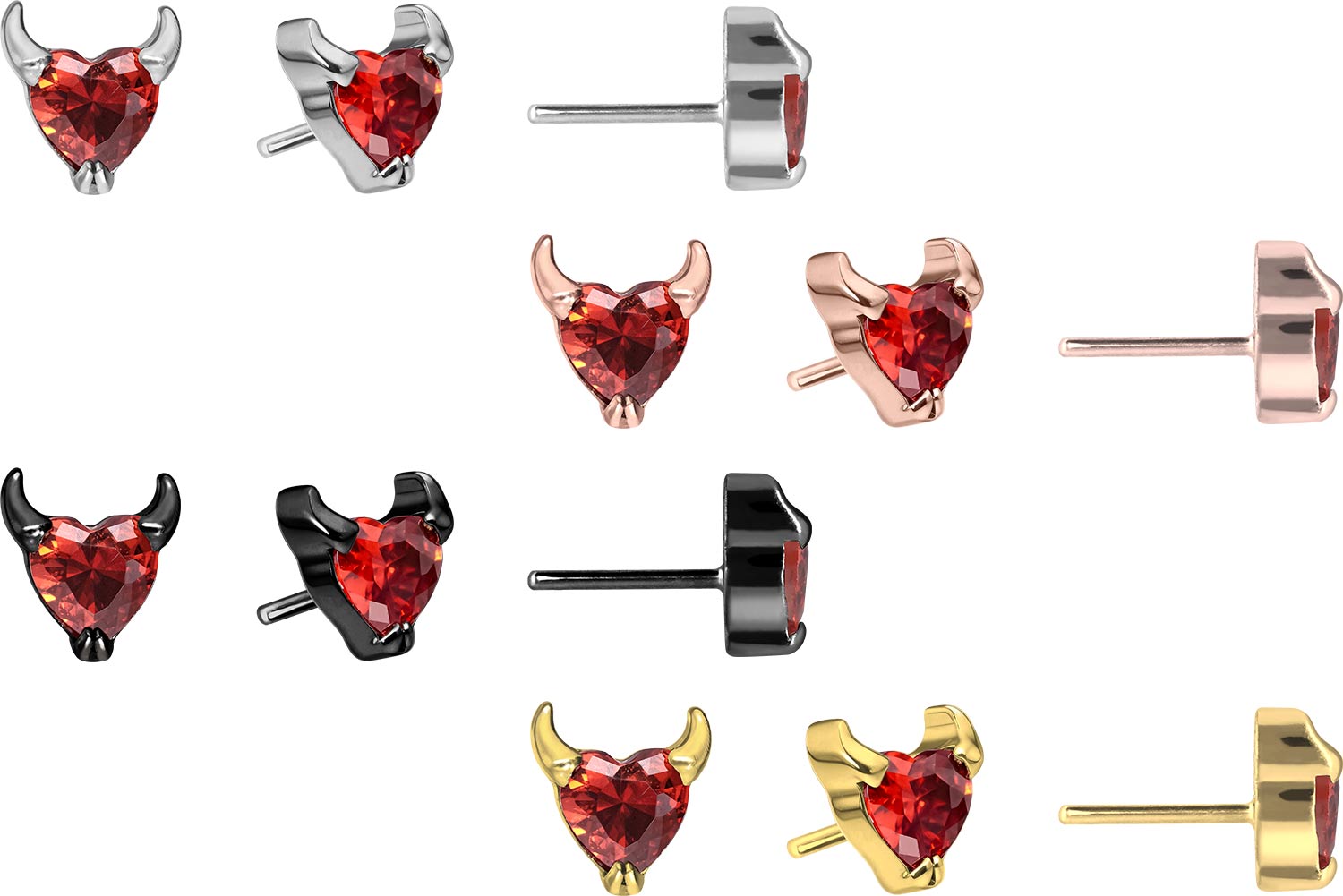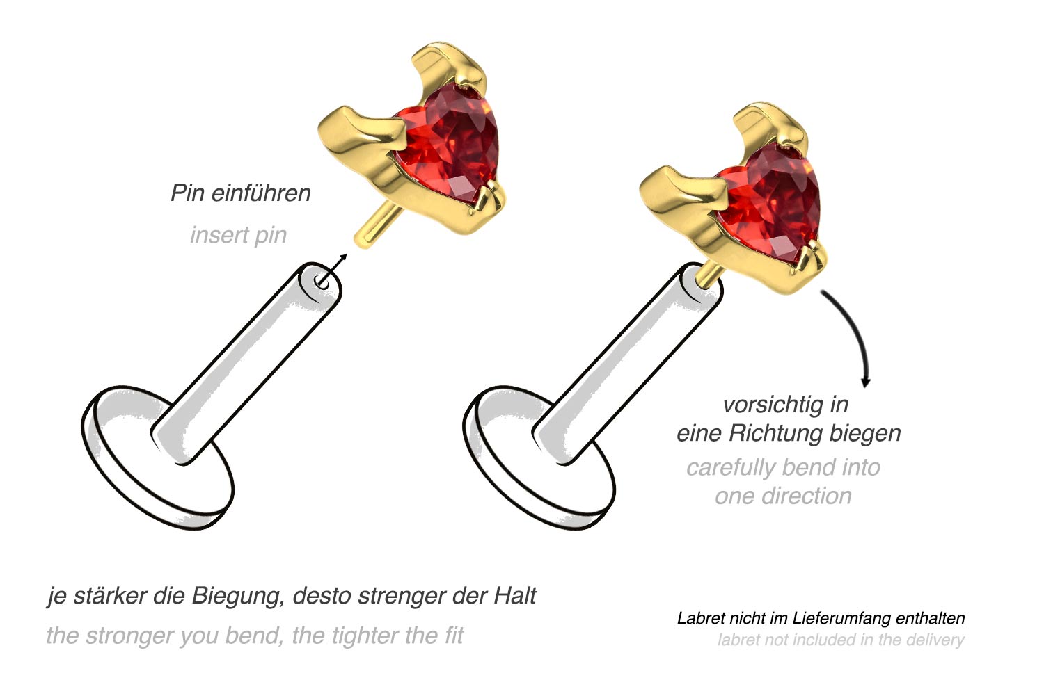 Dieser einzigartige Push Pin Aufsatz in Form eines Teufelsherzens wurde speziell für unsere Push Fit Piercings entwickelt und besteht aus hochwertigem Titan, das sich unter anderem durch gute Hautverträglichkeit und hohe Beständigkeit auszeichnet. Ebenfalls zu seinen spezifischen Materialeigenschaften gehört Farbechtheit, die sowohl bei der silberfarbenen als auch bei der schwarzen, gold- und roségoldfarbenen Variante mit PVD-Beschichtung gewährleistet wird. Zum Einsetzen muss der Pin nach Belieben gebogen werden. Es ist zu beachten, dass ein festerer Halt gewährleistet ist, wenn der Pin ein bisschen stärker gebogen wird. Darüber hinaus ist der Push Pin des Aufsatzes mit all unseren Push Fit Produkten kompatibel, sodass sich vielfältige Kombinationsmöglichkeiten ergeben.