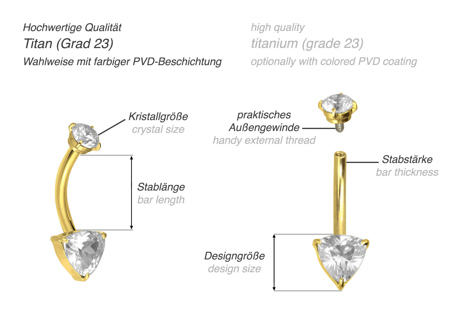 mit PVD-Beschichtung gewährleistet wird. Das funkelnde Kristalldreieck ist fest mit dem Bananabell verbunden, während sich der obere Kristall abschrauben lässt. Dies verdankt er dem 0,9 mm Außengewinde. Als Gegenstück verfügt das Bananabell über ein