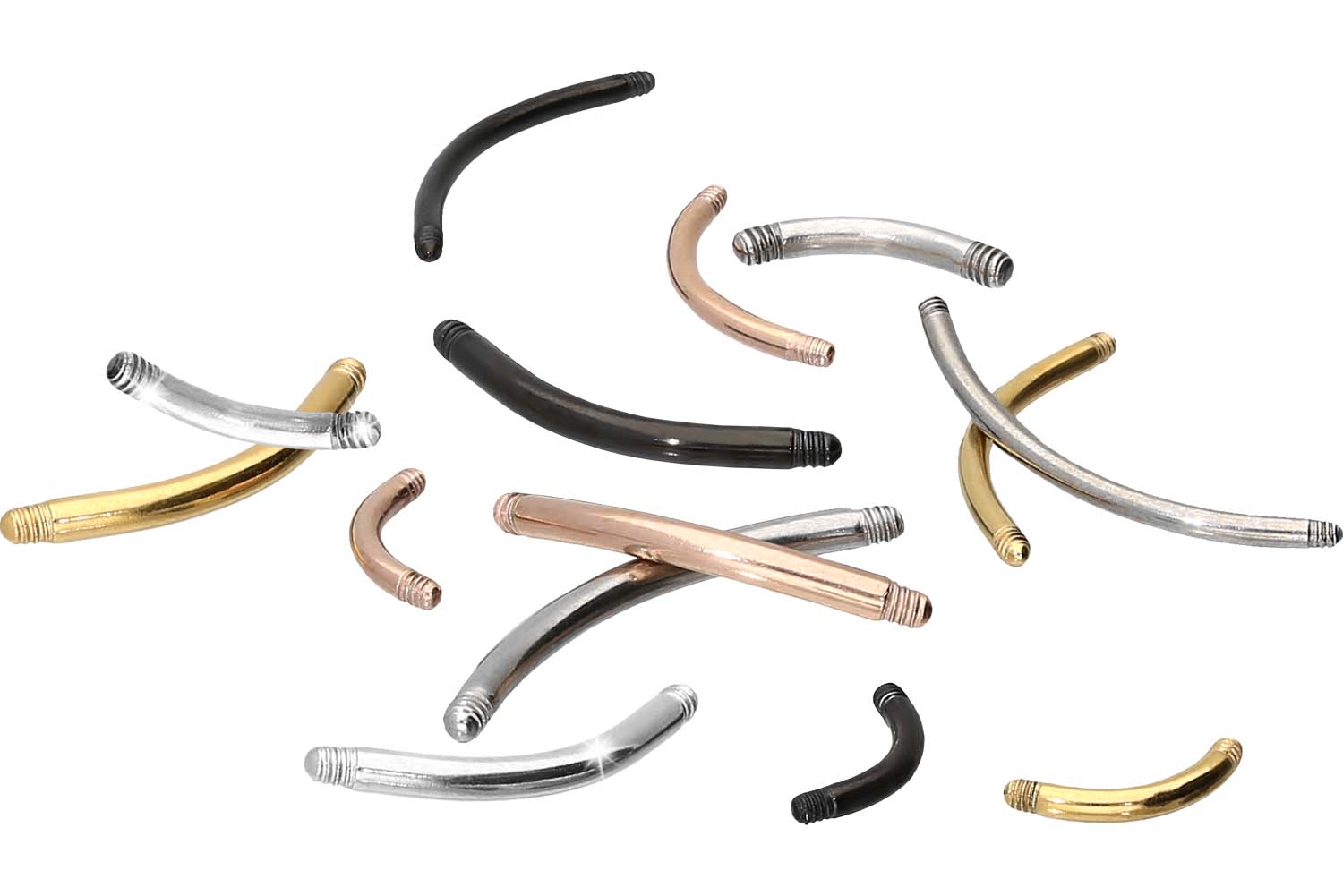 Diese klassische Banane ist aus hochwertigem Titan gefertigt, das je nach gewünschter Farbe mit einer kratzfesten PVD-Beschichtung versehen ist. Besonders erwähnenswert ist dabei die weißgoldfarbene PVD-Beschichtung, die dem schönen Schmuckstück einen hellen silbrigen Glanz verleiht. Zu den Materialeigenschaften von Titan gehören neben der hohen Qualität auch gute Hautverträglichkeit und hohe Beständigkeit. Die Banane wird ohne Kugeln geliefert, hat eine Stabstärke von entweder 1,2 oder 1,6 mm und ist mit den unten aufgeführten Stablängen erhältlich. Außerdem kann sie mit einer Vielzahl an Artikeln unseres Schraubzubehörs kombiniert werden.