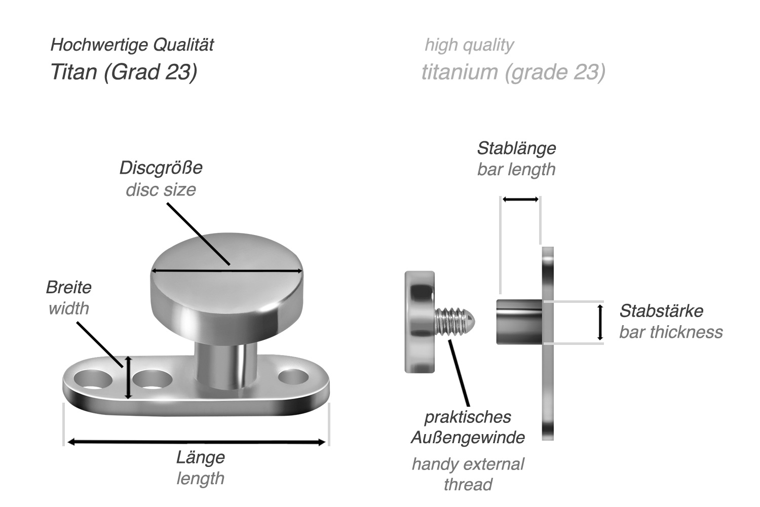 wiederum ein Stab mit einem 1,2 mm starken Innengewinde. So wird eine Vielzahl an Kombinationen mit den Dermal Anchor Aufsätzen aus unserem vielseitigen Sortiment ermöglicht. Ein solcher Aufsatz in Form einer schlichten Disc ist im Lieferumfang bereits enthalten. Die Stabstärke beträgt stets 1,6 mm,