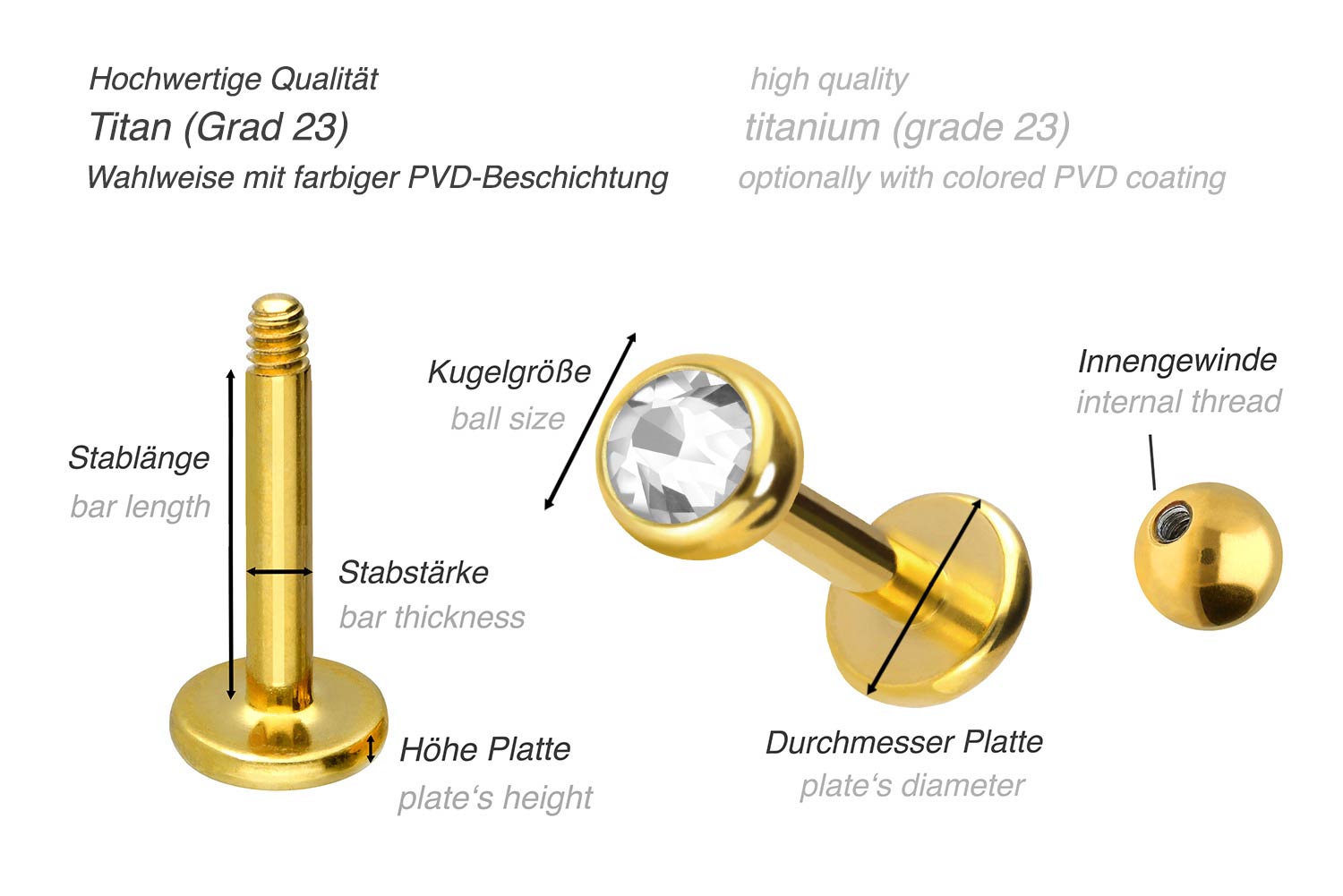 Dieses Labret ist aus hochwertigem Titan gefertigt, das je nach Farbwunsch mit einer kratzfesten PVD-Beschichtung versehen ist. Besonders hervorzuheben ist die weißgoldfarbene PVD-Beschichtung, die dem einzigartigen Schmuckstück einen hellen silbrigen Glanz verleiht. Zu den Materialeigenschaften von Titan gehören neben der hohen Qualität auch gute Hautverträglichkeit und Beständigkeit. Das Labret ist in den unten aufgeführten Stabstärken und -längen erhältlich. Als besonderes Highlight ist die Kugel mit einem schimmernden Kristall verziert. Darüber hinaus gibt es viele Kombinationsmöglichkeiten mit unserem Schraubzubehör, da die Kristallkugel abgeschraubt werden kann. Dies gilt auch für das Labret mit 1 mm Stabstärke, dank des 1,2 mm Gewindes.