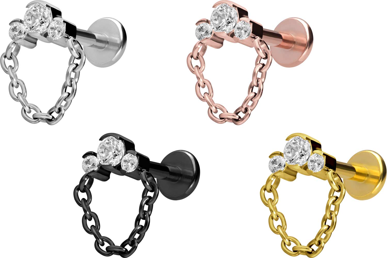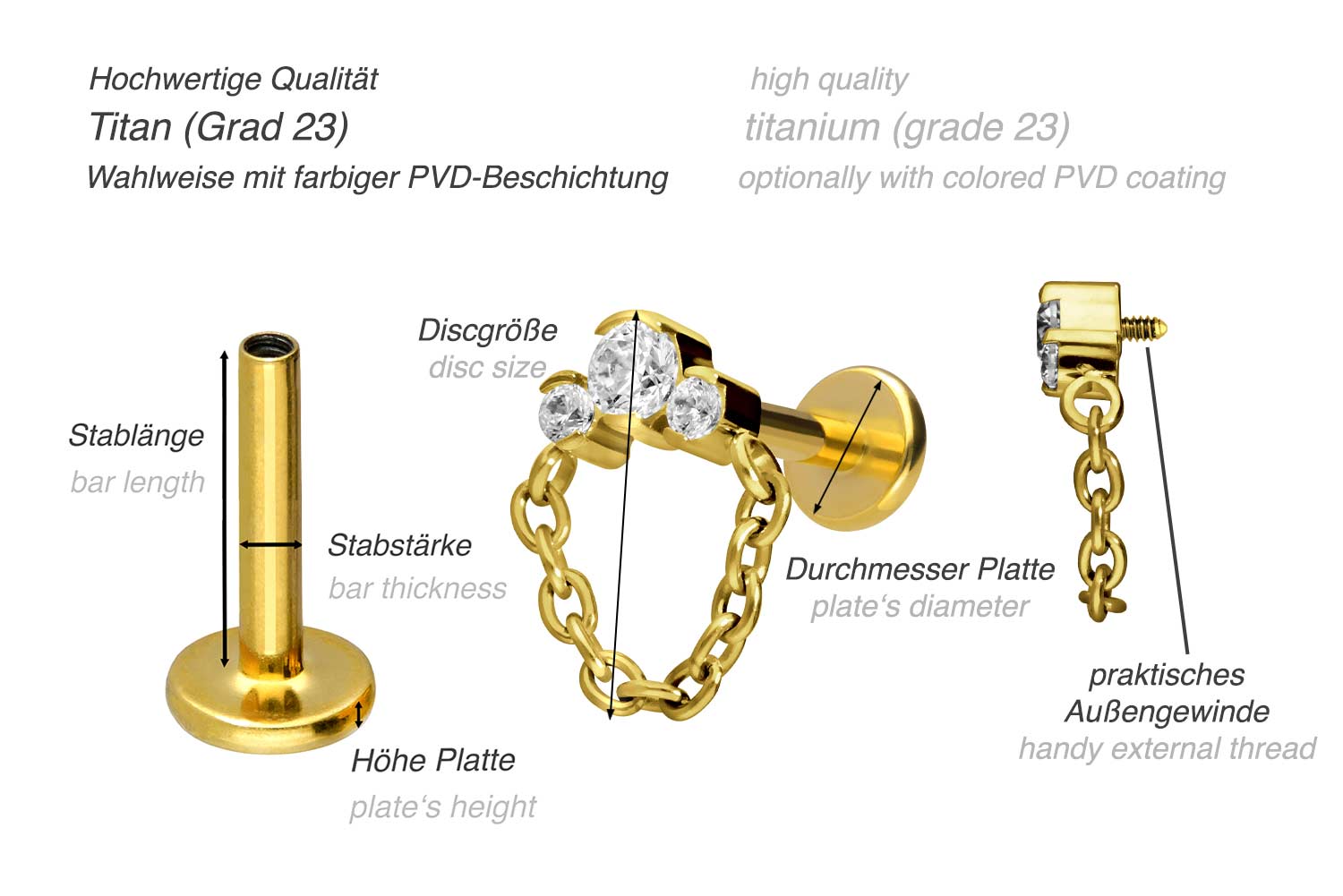 Dieses einzigartige Labret ist aus hochwertigem Titan gefertigt, das auch für Materialeigenschaften wie besonders gute Hautverträglichkeit und hohe Beständigkeit bekannt ist. Ebenfalls zu seinen Vorzügen gehört Farbechtheit, die auch bei den farbigen Varianten mit PVD-Beschichtung gewährleistet wird. Das Labret verfügt über einen zeitlos schönen Schraubaufsatz mit Außengewinde in Form von drei funkelnden Kristallen mit Fasssungen, an welchen eine Kette befestigt ist, hat eine Stabstärke von entweder 1,2 oder 1,6 mm und ist in den unten aufgeführten Stablängen erhältlich. Darüber hinaus kann sein 0,9 mm Innengewinde nach Belieben mit all unseren anderen Schraubaufsätzen mit entsprechendem Außengewinde kombiniert werden.