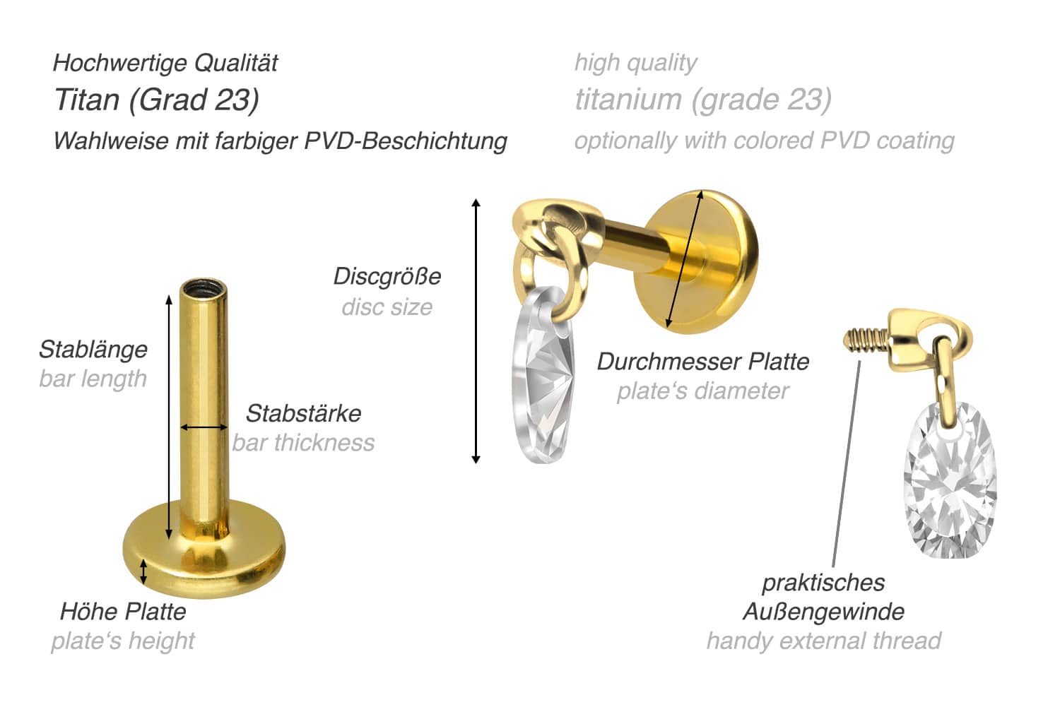 Dieses einzigartige Labret ist aus hochwertigem Titan gefertigt, das auch für Materialeigenschaften wie besonders gute Hautverträglichkeit und hohe Beständigkeit bekannt ist. Ebenfalls zu seinen Vorzügen gehört Farbechtheit, die auch bei den farbigen Varianten mit PVD-Beschichtung gewährleistet wird. Das Labret verfügt über einen zeitlos schönen Schraubaufsatz mit Außengewinde in Form eines funkelnden Ovals, hat eine Stabstärke von entweder 1,2 oder 1,6 mm und ist in den unten aufgeführten Stablängen erhältlich. Darüber hinaus kann sein 0,9 mm Innengewinde nach Belieben mit all unseren anderen Schraubaufsätzen mit entsprechendem Außengewinde kombiniert werden.
