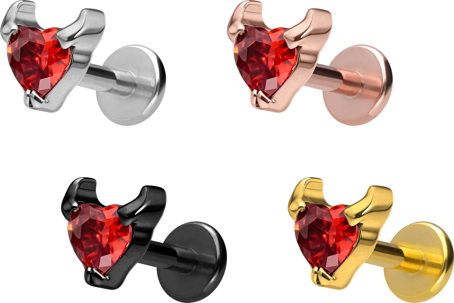 Dieses einzigartige Labret ist aus hochwertigem Titan gefertigt, das auch für Materialeigenschaften wie besonders gute Hautverträglichkeit und hohe Beständigkeit bekannt ist. Ebenfalls zu seinen Vorzügen gehört Farbechtheit, die auch bei den farbigen Varianten mit PVD-Beschichtung gewährleistet wird. Das Labret verfügt über einen zeitlos schönen Schraubaufsatz mit Außengewinde in Form eines Teufelsherzens, hat eine Stabstärke von entweder 1,2 oder 1,6 mm und ist in den unten aufgeführten Stablängen erhältlich. Darüber hinaus kann sein 0,9 mm Innengewinde nach Belieben mit all unseren anderen Schraubaufsätzen mit entsprechendem Außengewinde kombiniert werden.