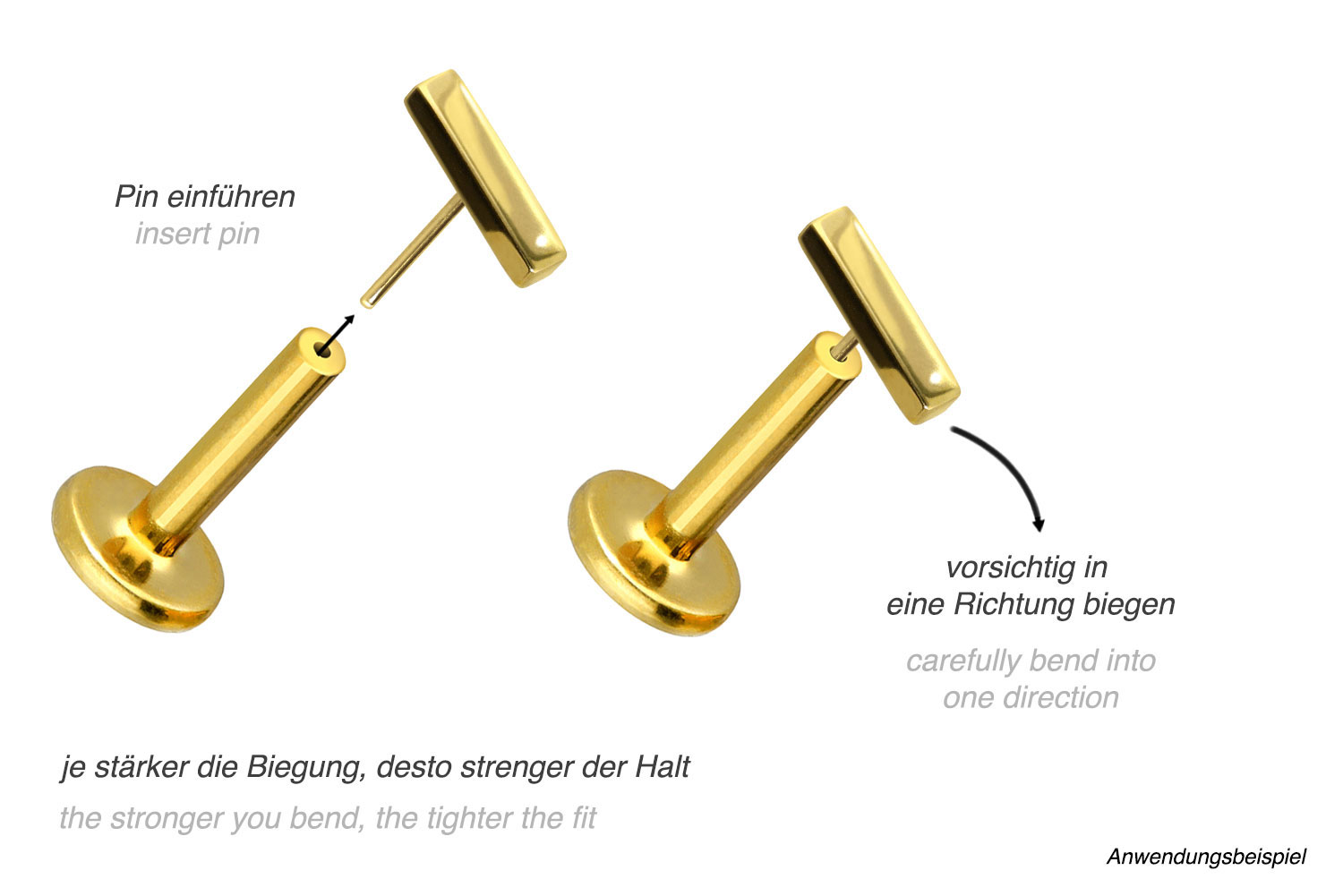 Durch die verwendete Push Fit Technologie kann das Labret nach Belieben mit all unseren Aufsätzen mit Push Pin kombiniert werden.
