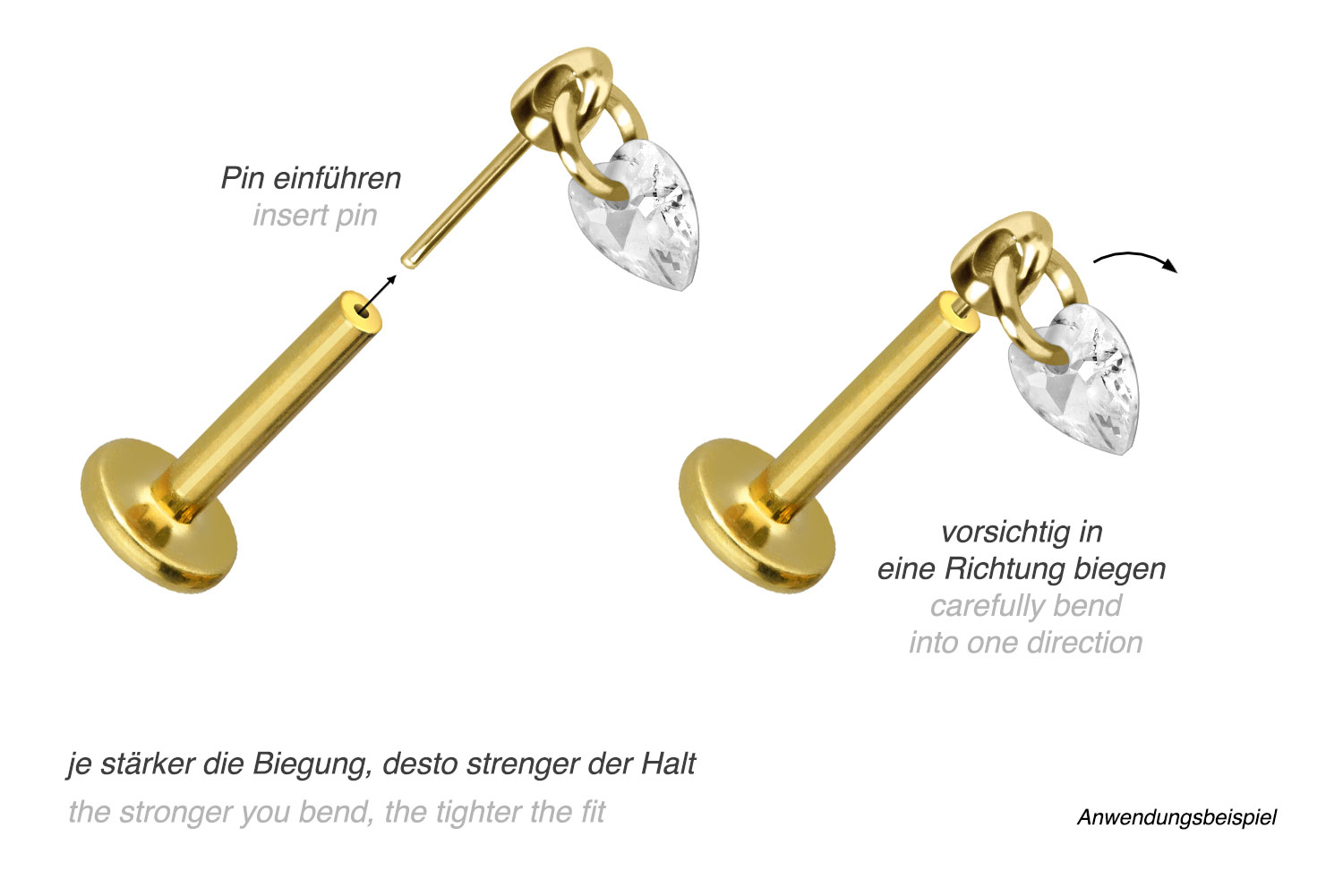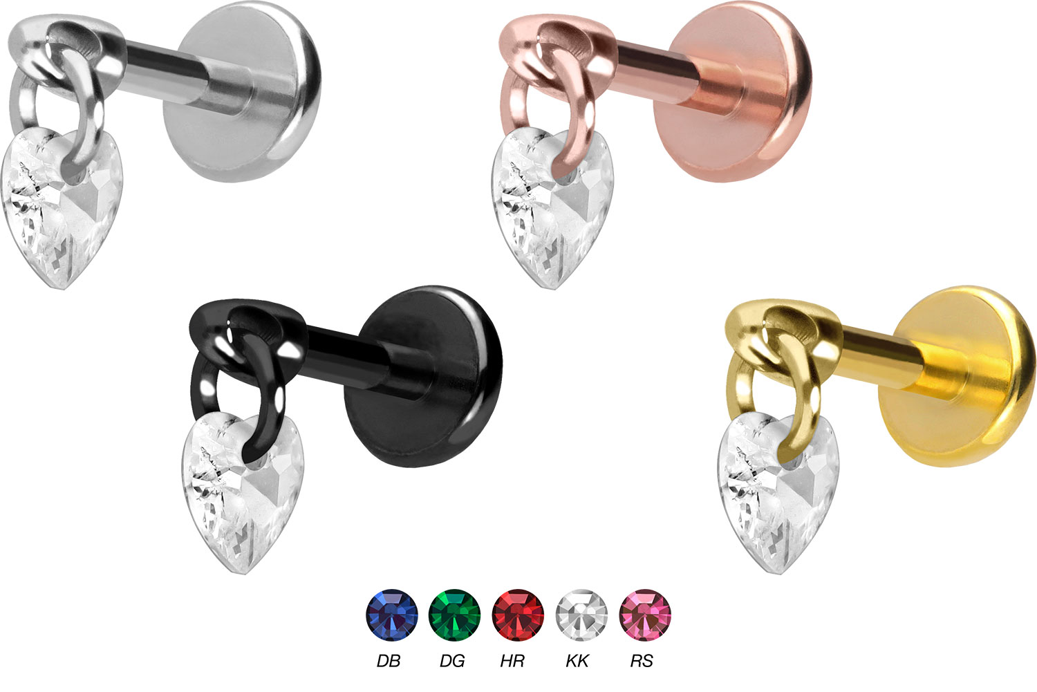 Dieses einzigartige Labret ist aus hochwertigem Titan gefertigt, das auch für Materialeigenschaften wie besonders gute Hautverträglichkeit und hohe Beständigkeit bekannt ist. Ebenfalls zu seinen Vorzügen gehört Farbechtheit, die auch bei den farbigen Varianten mit PVD-Beschichtung gewährleistet wird. Das Labret verfügt über einen zeitlos schönen Aufsatz mit Push Pin in Form eines funkelnden Herzens, hat eine Stabstärke von entweder 1 oder 1,2 mm und ist in den unten aufgeführten Stablängen erhältlich. Durch die verwendete Push Fit Technologie kann das Labret nach Belieben mit all unseren Aufsätzen mit Push Pin kombiniert werden.
