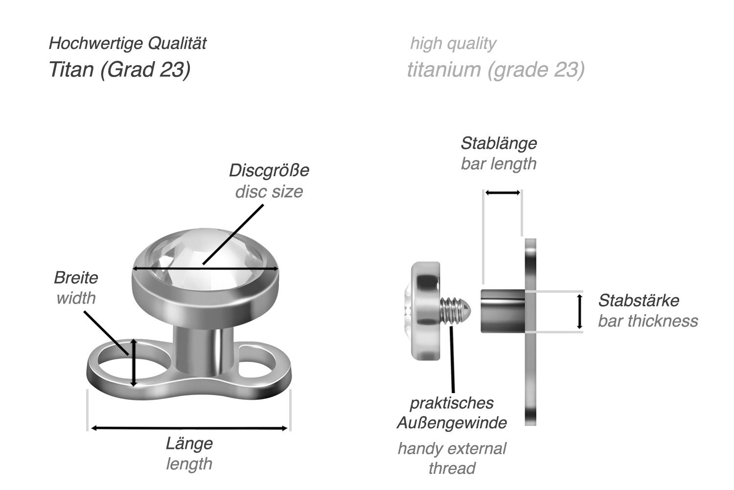 Bei dem Material, aus dem dieser Mini Dermal Anchor besteht, handelt es sich um hochwertiges Titan. Es ist unter anderem für nützliche Eigenschaften wie etwa besonders gute Hautverträglichkeit und hohe Beständigkeit bekannt. Der Dermal Anchor selbst verfügt über eine kleine Platte mit zwei Löchern, die einen idealen Halt im Gewebe gewährleisten. Auf der Platte befindet sich wiederum ein Stab mit einem 1,2 mm starken Innengewinde. So wird eine Vielzahl an Kombinationen mit den Dermal Anchor Aufsätzen aus unserem vielseitigen Sortiment ermöglicht. Ein solcher Aufsatz in Form einer Disc mit funkelndem Kristall ist im Lieferumfang bereits enthalten. Die Stabstärke beträgt stets 1,6 mm, wohingegen die erhältlichen Stablängen unten aufgeführt sind.