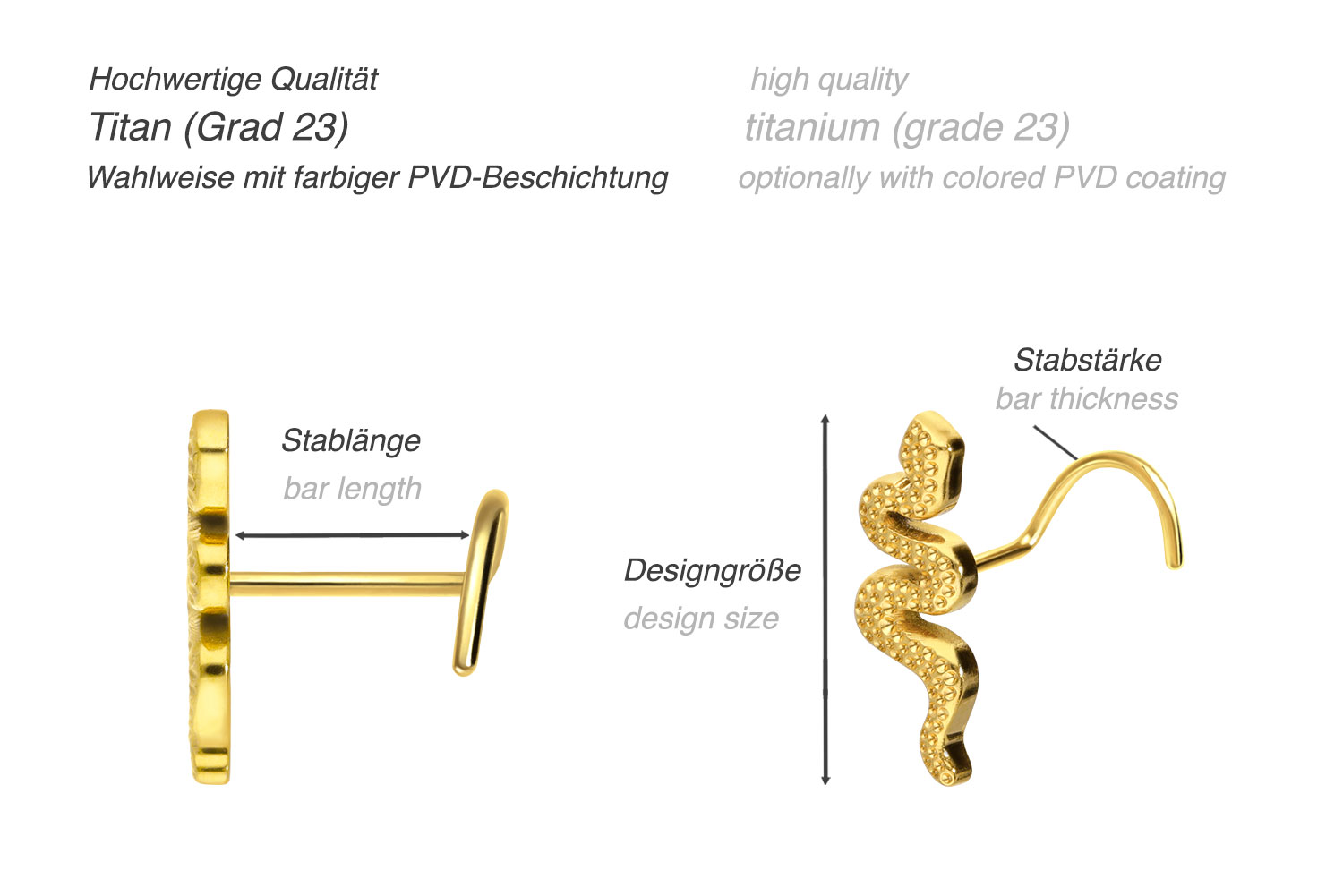 Dieser stilvolle Nasenstecker ist aus hochwertigem Titan gefertigt, das je nach gewünschter Farbe mit einer kratzfesten PVD-Beschichtung überzogen ist. Zu den Materialeigenschaften von Titan gehören neben der hohen Qualität auch gute Hautverträglichkeit und Beständigkeit. Ein besserer Halt in der Nase wird durch die Spiralform gewährleistet. Als besonderes Highlight ziert das wunderschöne Schmuckstück eine Schlange. Der Nasenstecker verfügt darüber hinaus über eine Stabstärke von 0,8 mm und eine Stablänge von 6 mm.