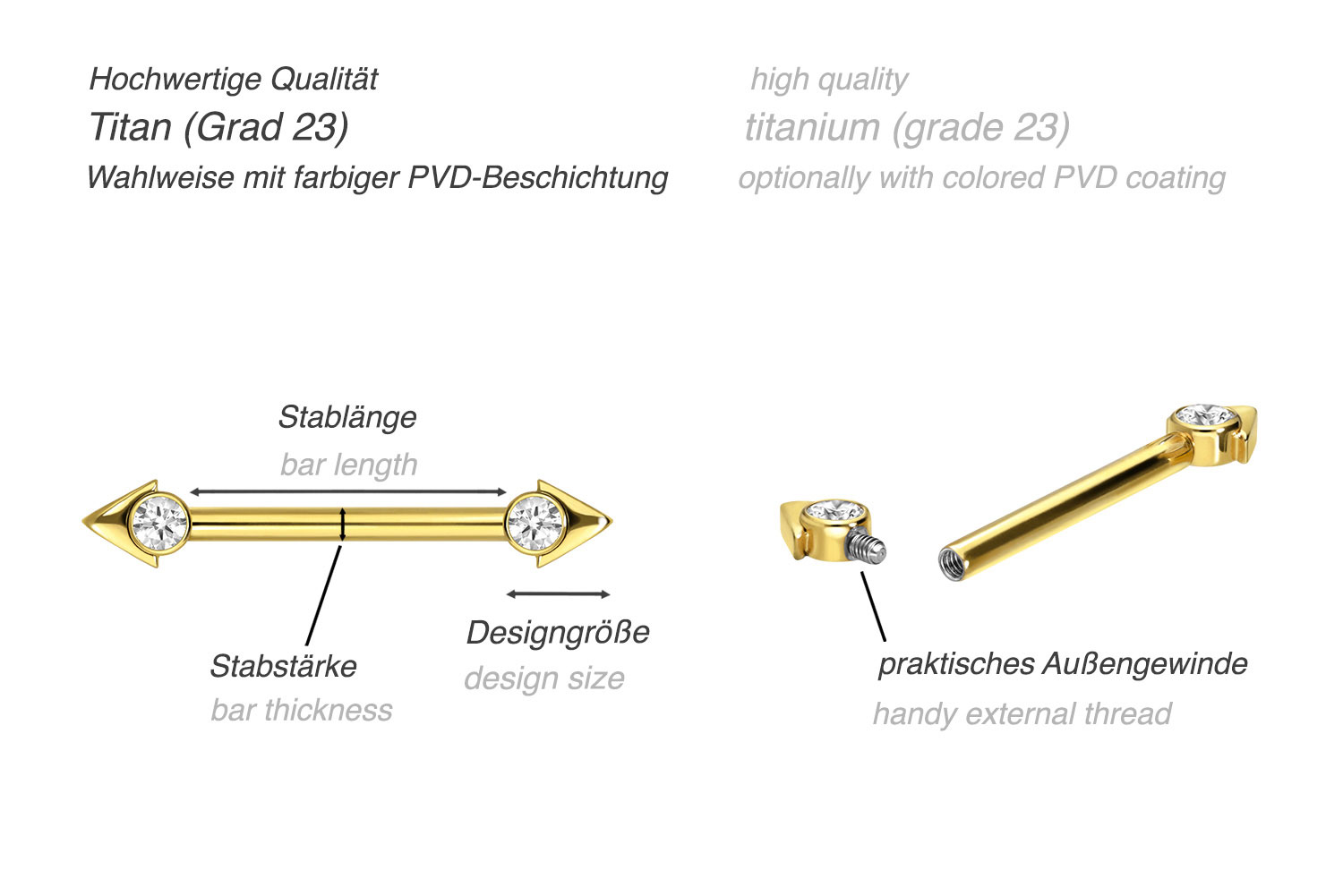 PVD-Beschichtung gewährleistet wird. An beiden Enden des Stabes befindet sich eine Pfeilspitze mit Kristall, von denen eine abschraubbar ist. So wird der Einsatz des Piercings ermöglicht und gleichzeitig gewährleistet, dass beide Designs nach vorne ausgerichtet sind. Es verfügt über eine Stabstärke von 1,6 mm