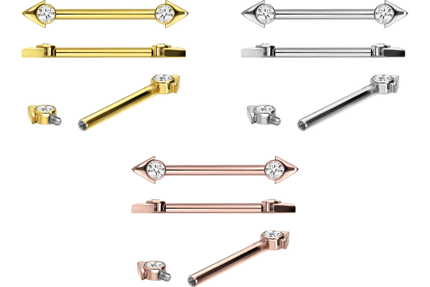 PVD-Beschichtung gewährleistet wird. An beiden Enden des Stabes befindet sich eine Pfeilspitze mit Kristall, von denen eine abschraubbar ist. So wird der Einsatz des Piercings ermöglicht und gleichzeitig gewährleistet, dass beide Designs nach vorne ausgerichtet sind. Es verfügt über eine Stabstärke von 1,6 mm
