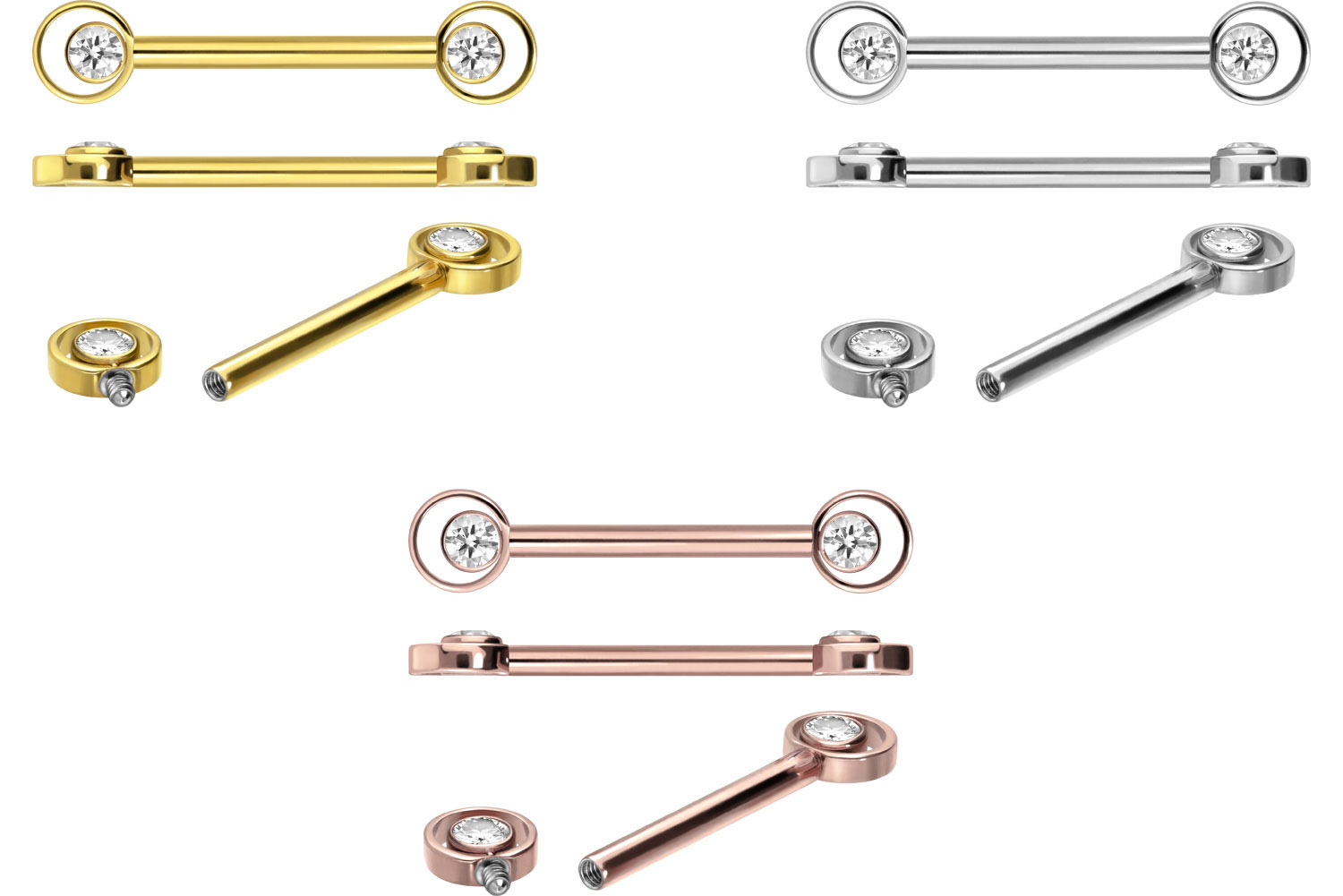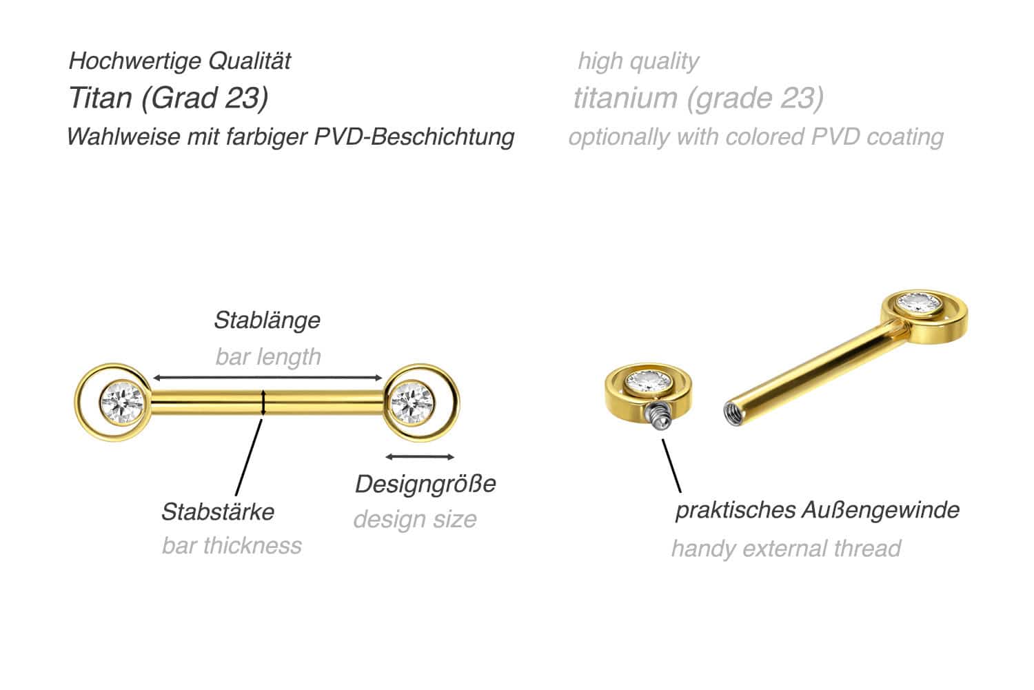 Kristall, von denen einer abschraubbar ist. So wird der Einsatz des Piercings ermöglicht und gleichzeitig gewährleistet, dass beide Designs nach vorne ausgerichtet sind. Es verfügt über eine Stabstärke von 1,6 mm und