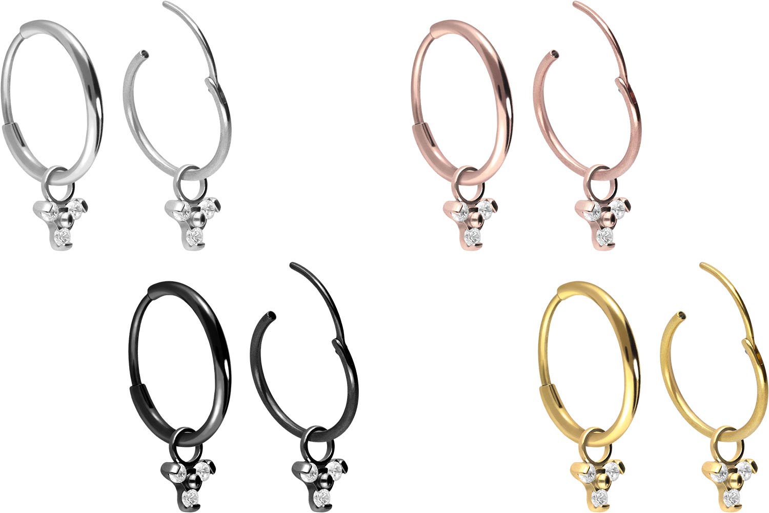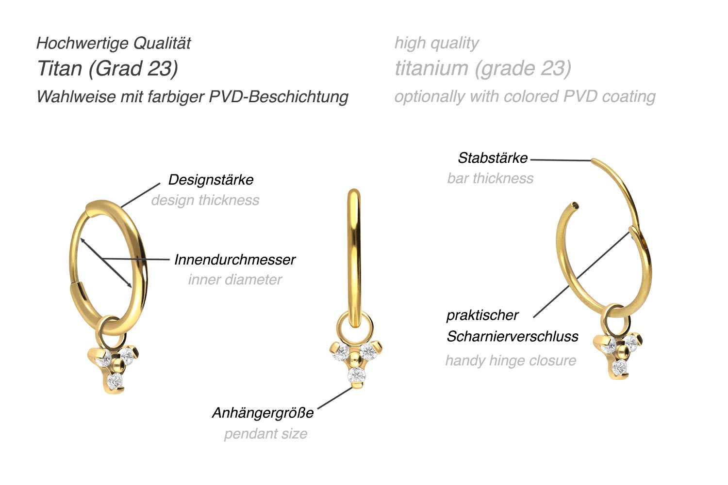 Farbe nach Wahl, die durch die Hochglanzpolitur zusätzlich veredelt wird. Als optisches Highlight ist jeweils ein Anhänger in Form einer Kristallblume an jeder Creole angebracht. Der in den Stichkanal einzuführende Stab hat eine Stärke von 0,8 mm, wohingegen die Stärke des sichtbaren Designs entweder 1,2 oder 1,6 mm beträgt. Die Creolen werden wie abgebildet paarweise geliefert.