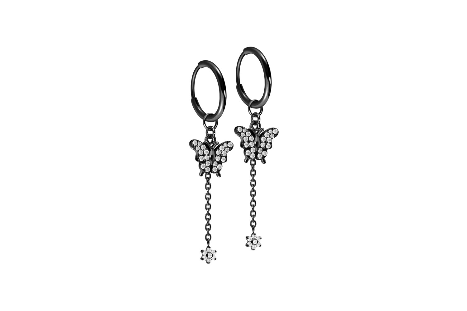 Farbe nach Wahl, die durch die Hochglanzpolitur zusätzlich veredelt wird. Als optisches Highlight ist jeweils ein Anhänger in Form eines mit Kristallen besetzten Schmetterlings und einer Kristallblume, welche über eine Kette verbunden sind, an jeder Creole angebracht. Der in den Stichkanal einzuführende Stab hat eine Stärke von 0,8 mm, wohingegen die Stärke des sichtbaren Designs entweder 1,2 oder 1,6 mm beträgt. Die Creolen werden wie abgebildet paarweise geliefert.