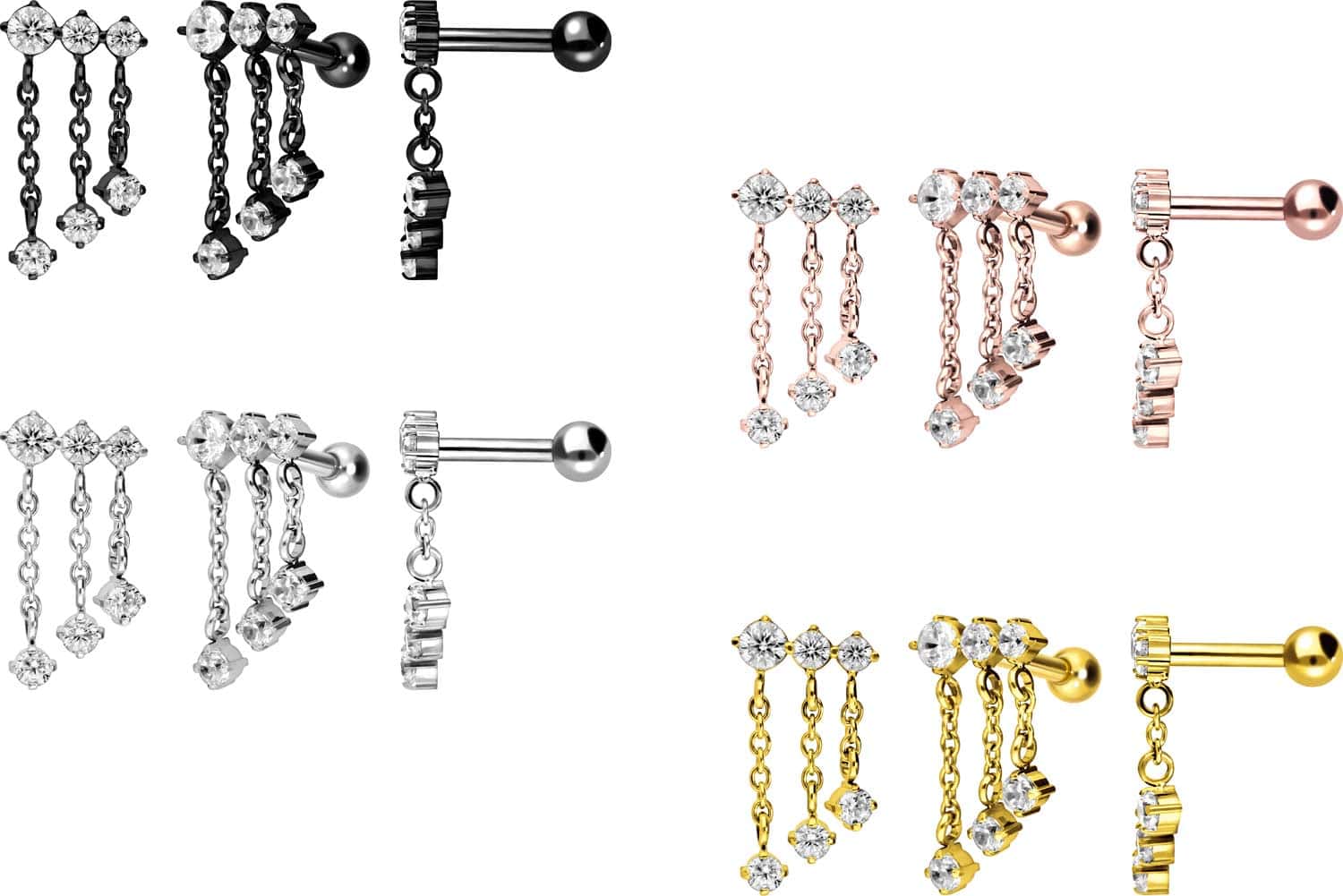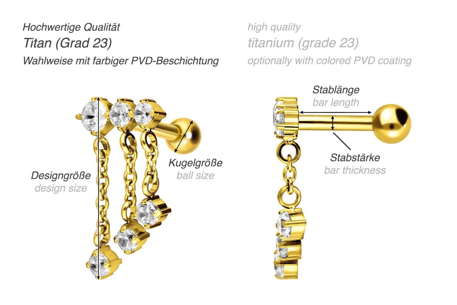 Dieses atemberaubend schöne Ohrpiercing besteht aus hochwertigem Titan, das bekanntermaßen über Materialeigenschaften wie gute Hautvertäglichkeit und hohe Beständigkeit verfügt. Im Falle der schwarzen, gold- und roségoldfarbenen Variante ist es mit einer kratzfesten PVD-Beschichtung überzogen. Visuell überzeugt das Schmuckstück mithilfe des Design, welches an ein funkelndes Windspiel erinnert. Erhältlich ist das Ohrpiercing mit einer Stabstärke von 1,2 mm und einer Stablänge von 6 mm.