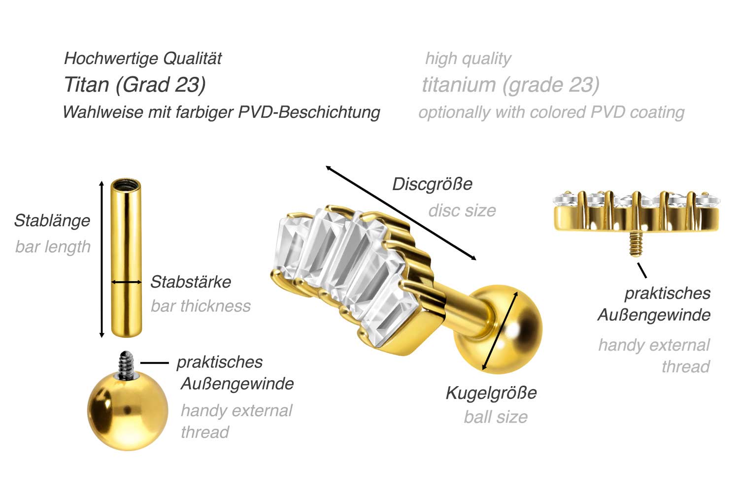 PVD-Beschichtung gewährleistet wird. Visuell überzeugt das Schmuckstück durch den zeitlos schönen Schraubaufsatz mit Außengewinde in Form von 5 eingefassten Kristallen. Das Ohrpiercing hat eine Stabstärke von 1,2 mm und ist mit einer Stablänge von entweder 6 oder 8 mm erhältlich. Darüber hinaus können sowohl der Aufsatz als auch die hintere 3 mm Kugel durch das 0,9 mm Innengewinde nach Belieben durch all unsere anderen Schraubaufsätze mit entsprechendem Außengewinde ausgetauscht werden.