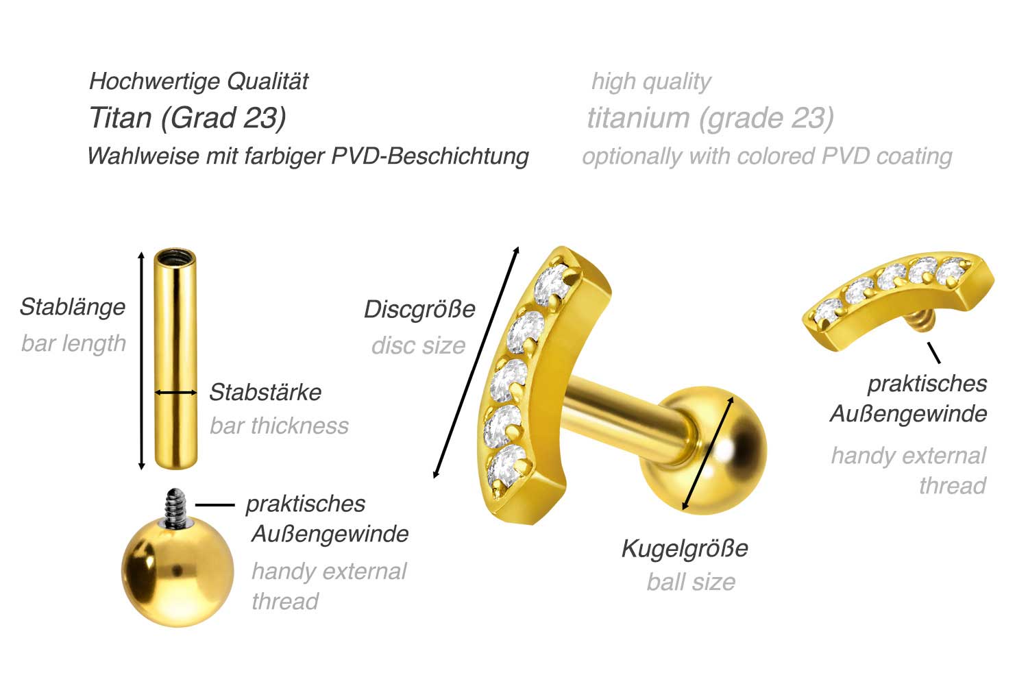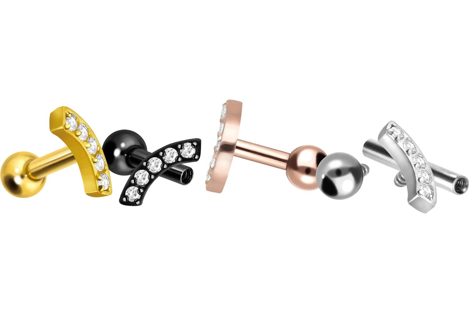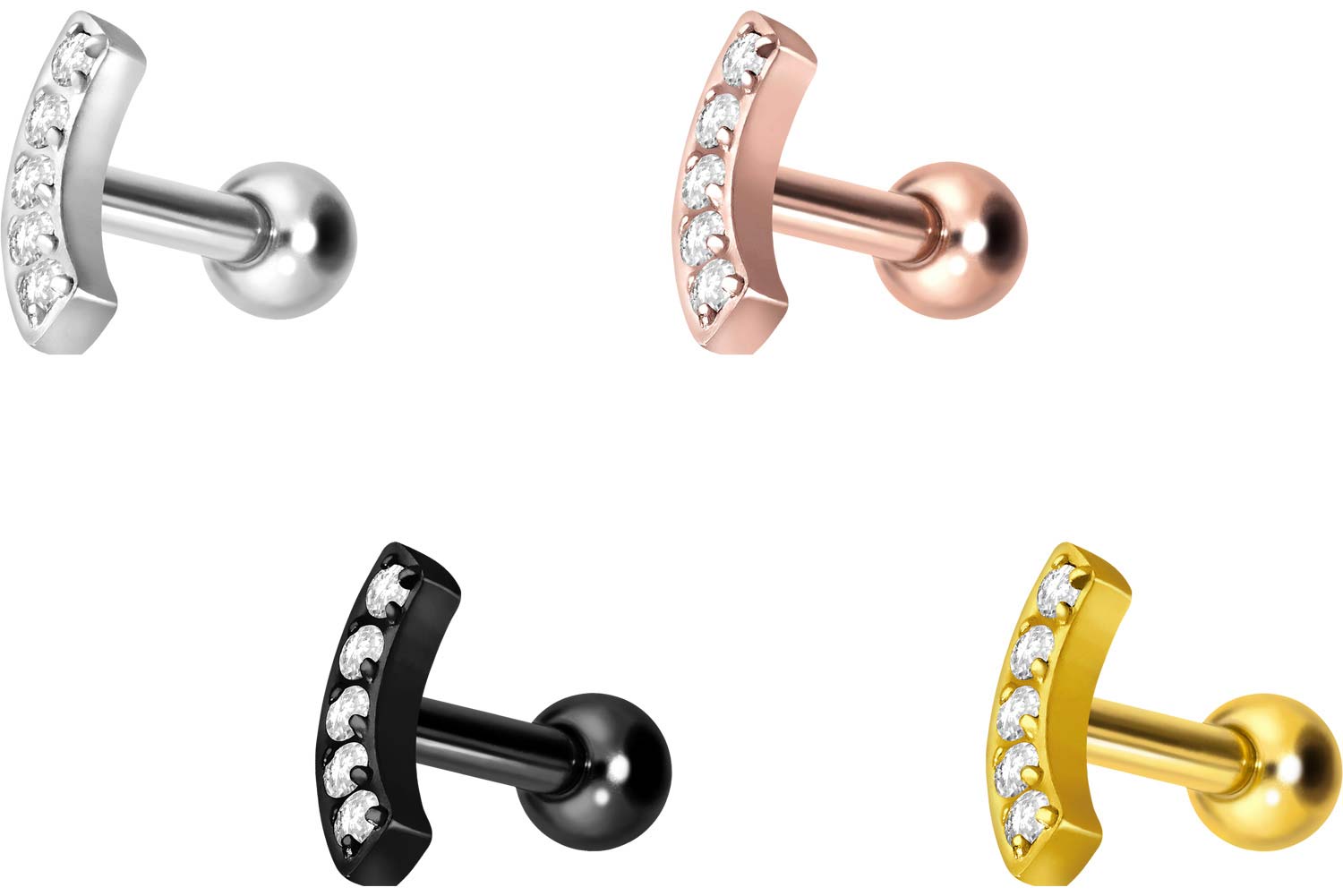 PVD-Beschichtung gewährleistet wird. Visuell überzeugt das Schmuckstück durch den zeitlos schönen Schraubaufsatz mit Außengewinde in Form eines Bogens, welcher mit 5 funkelnden Kristallen besetzt ist. Das Ohrpiercing hat eine Stabstärke von 1,2 mm und ist mit einer Stablänge von entweder 6 oder 8 mm erhältlich. Darüber hinaus können sowohl der Aufsatz als auch die hintere 3 mm Kugel durch das 0,9 mm Innengewinde nach Belieben durch all unsere anderen Schraubaufsätze mit entsprechendem Außengewinde ausgetauscht werden.