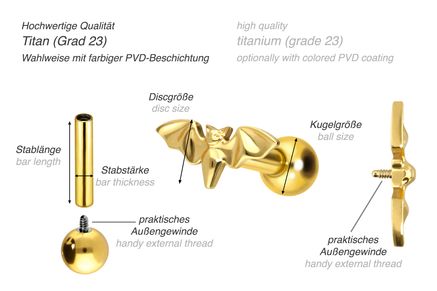 PVD-Beschichtung gewährleistet wird. Visuell überzeugt das Schmuckstück durch den zeitlos schönen Schraubaufsatz mit Außengewinde in Form einer Fledermaus. Das Ohrpiercing hat eine Stabstärke von 1,2 mm und ist mit einer Stablänge von entweder 6 oder 8 mm erhältlich. Darüber hinaus können sowohl der Aufsatz als auch die hintere 3 mm Kugel durch das 0,9 mm Innengewinde nach Belieben durch all unsere anderen Schraubaufsätze mit entsprechendem Außengewinde ausgetauscht werden.