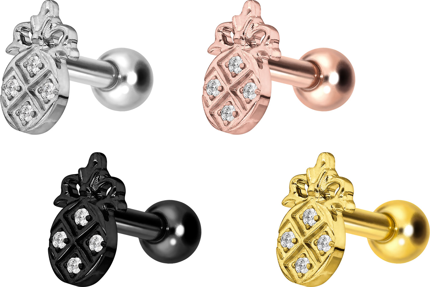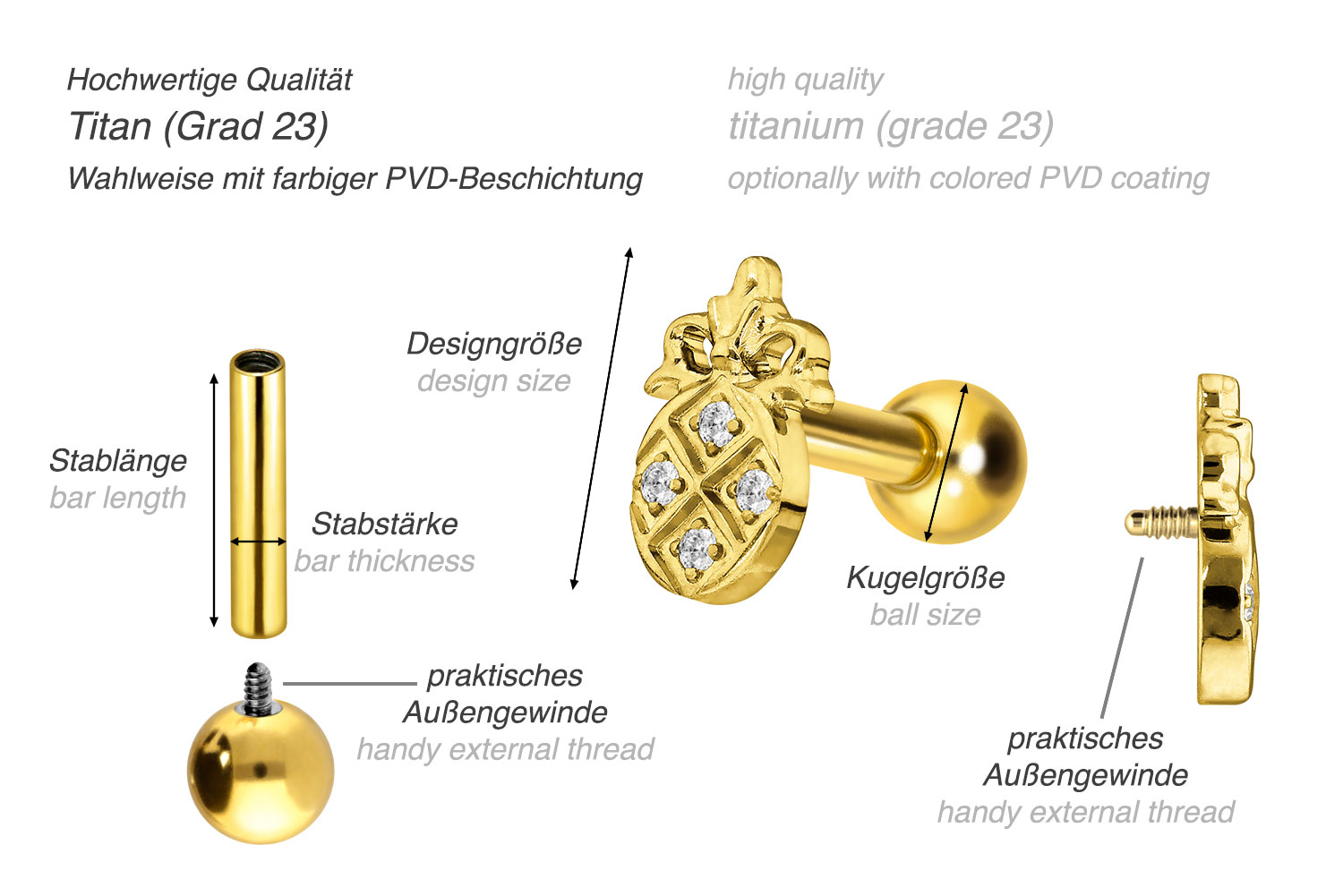 PVD-Beschichtung gewährleistet wird. Visuell überzeugt das Schmuckstück durch den zeitlos schönen Schraubaufsatz mit Außengewinde in Form einer funkelnden Ananas. Das Ohrpiercing hat eine Stabstärke von 1,2 mm und ist mit einer Stablänge von entweder 6 oder 8 mm erhältlich. Darüber hinaus können sowohl der Aufsatz als auch die hintere 3 mm Kugel durch das 0,9 mm Innengewinde nach Belieben durch all unsere anderen Schraubaufsätze mit entsprechendem Außengewinde ausgetauscht werden.