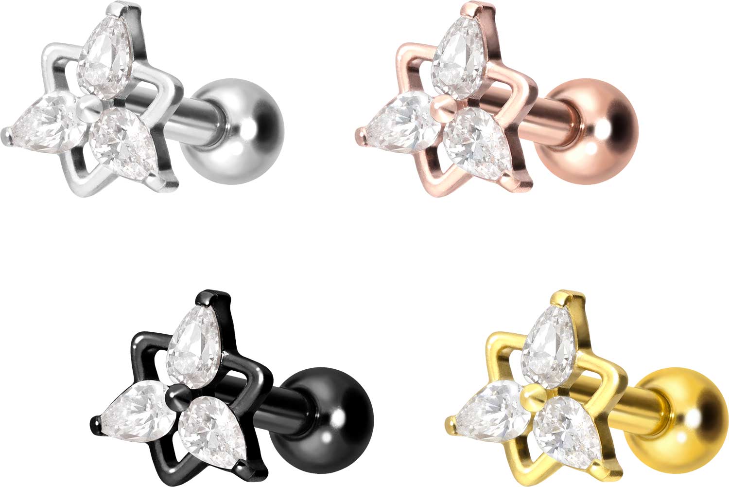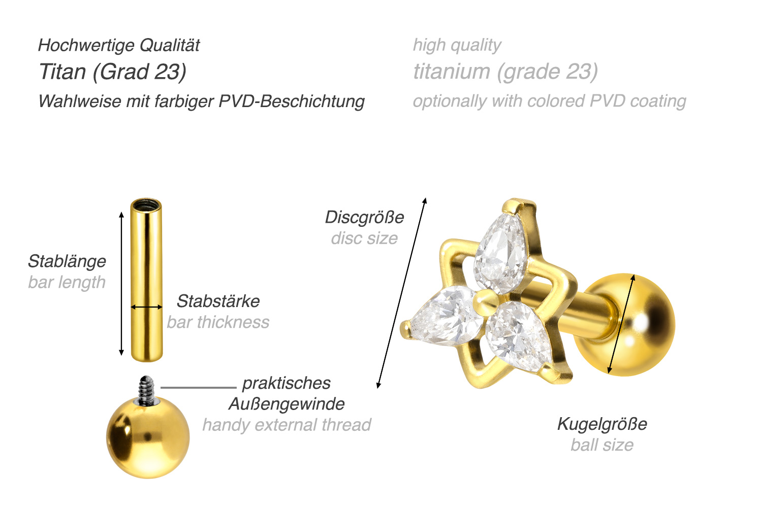 Dieses atemberaubend schöne Ohrpiercing ist aus hochwertigem Titan gefertigt, das auch für Materialeigenschaften wie besonders gute Hautverträglichkeit und hohe Beständigkeit bekannt ist. Ebenfalls zu seinen Vorzügen gehört Farbechtheit, die auch bei den farbigen Varianten mit PVD-Beschichtung gewährleistet wird. Visuell überzeugt das Schmuckstück durch den zeitlos schönen Schraubaufsatz mit Außengewinde in Form einer Kristallblume. Das Ohrpiercing hat eine Stabstärke von 1,2 mm und ist mit einer Stablänge von entweder 6 oder 8 mm erhältlich. Darüber hinaus können sowohl der Aufsatz als auch die hintere 3 mm Kugel durch das 0,9 mm Innengewinde nach Belieben durch all unsere anderen Schraubaufsätze mit entsprechendem Außengewinde ausgetauscht werden.
