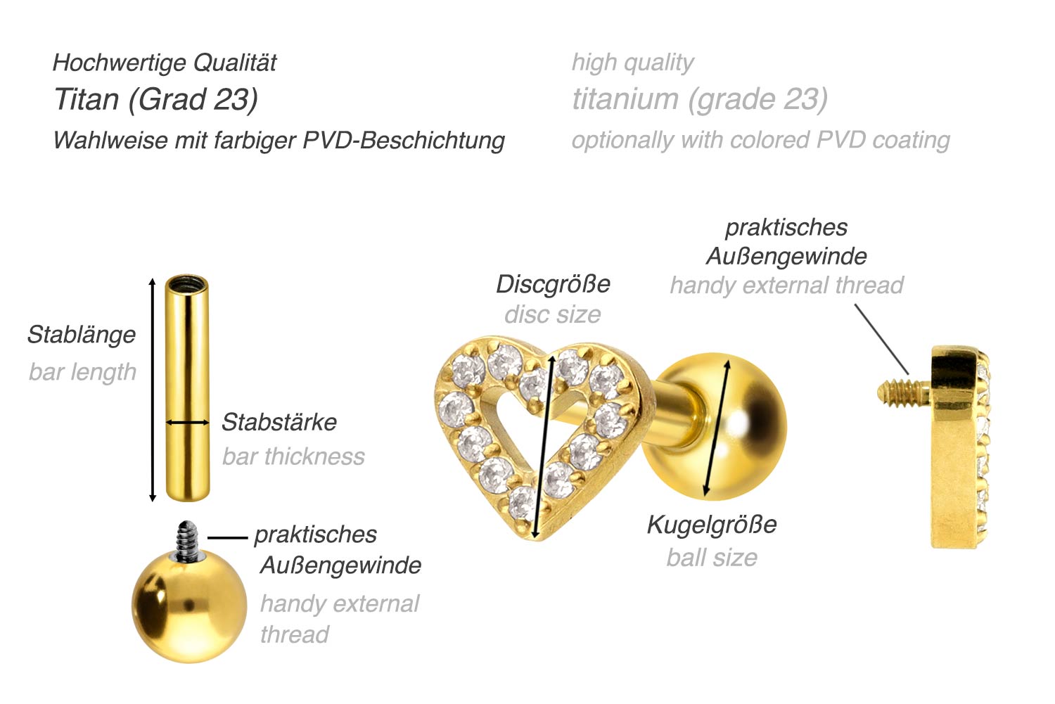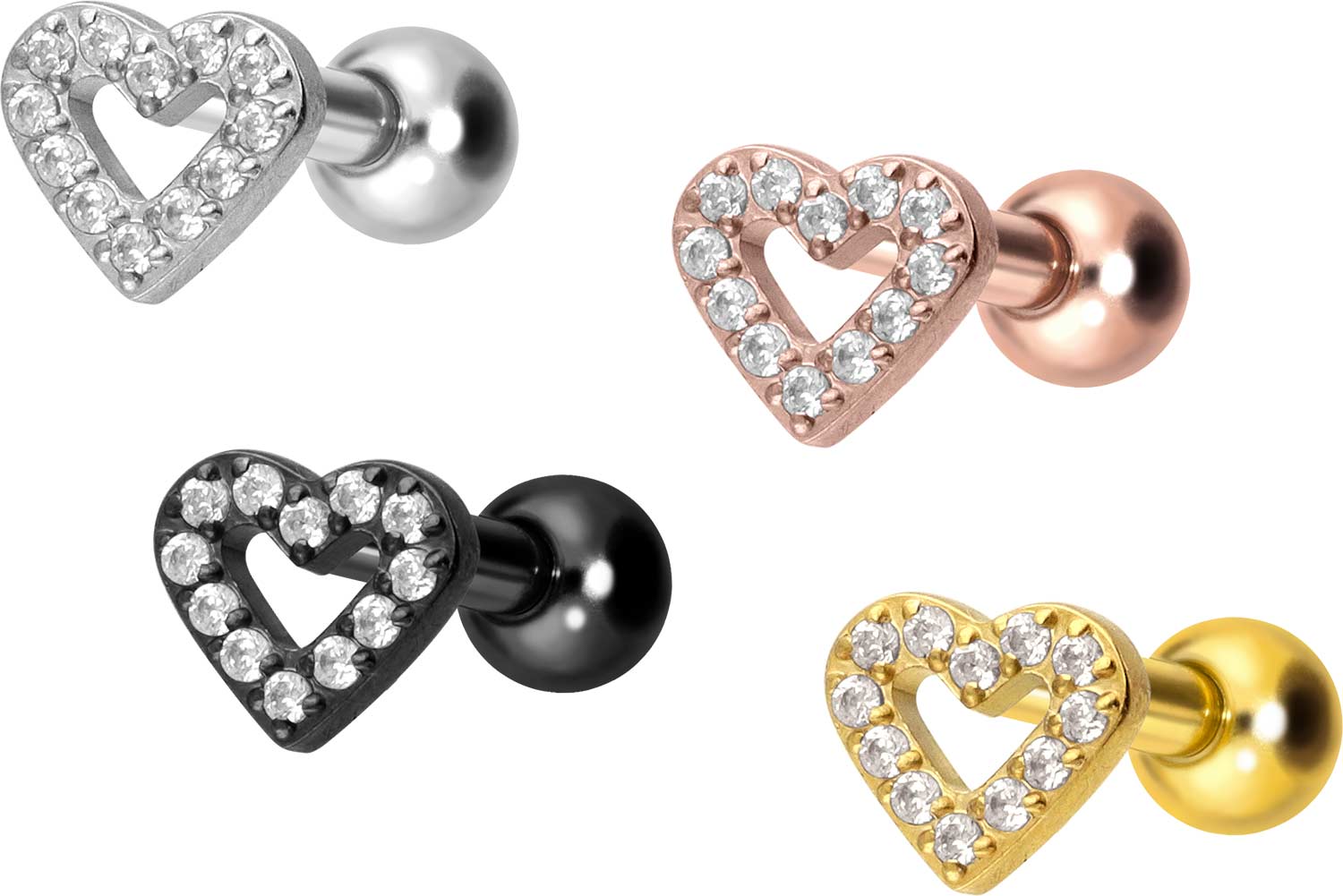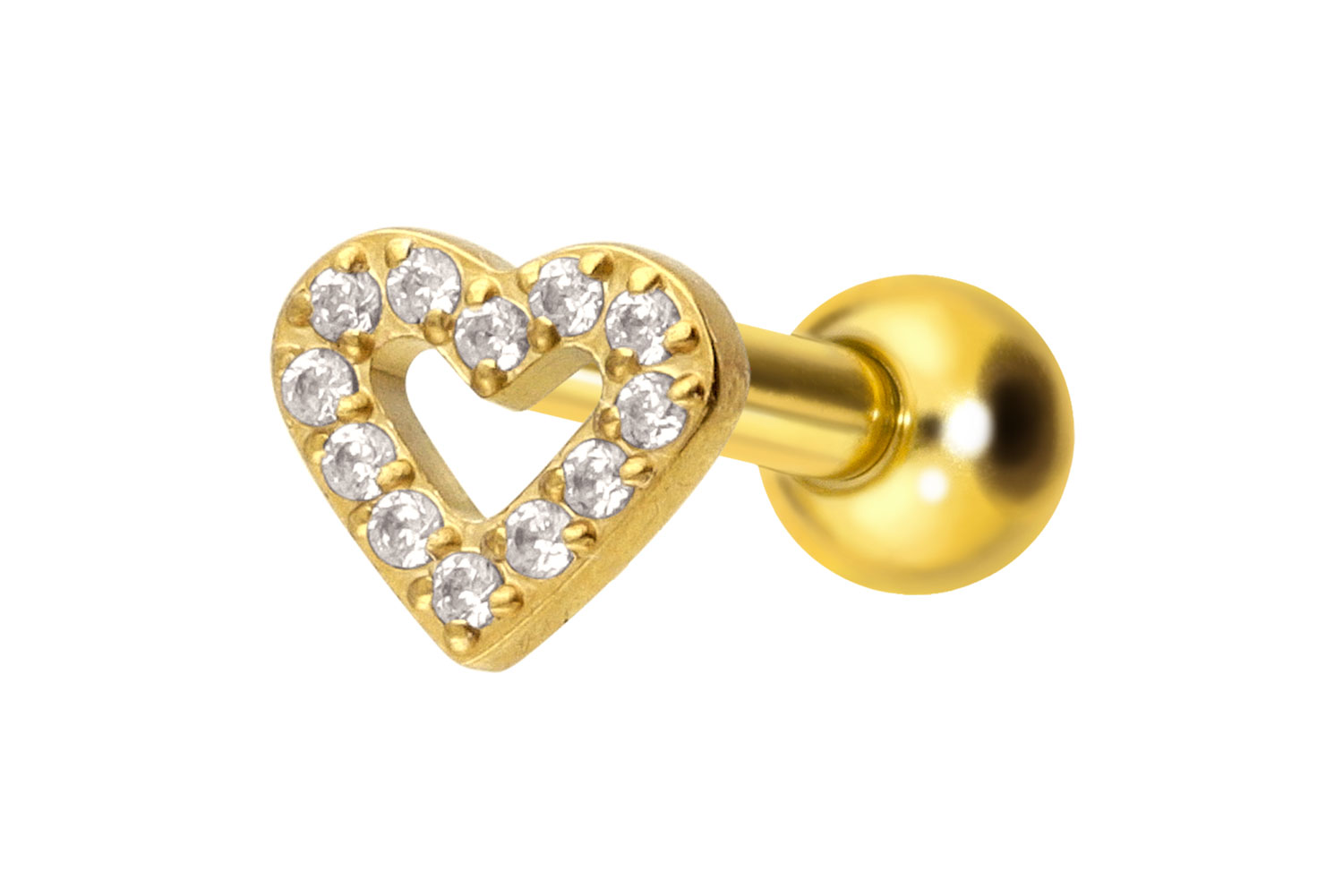 PVD-Beschichtung gewährleistet wird. Visuell überzeugt das Schmuckstück durch den zeitlos schönen Schraubaufsatz mit Außengewinde in Form eines kristallbesetzten Herzens. Das Ohrpiercing hat eine Stabstärke von 1,2 mm und ist mit einer Stablänge von entweder 6 oder 8 mm erhältlich. Darüber hinaus können sowohl der Aufsatz als auch die hintere 3 mm Kugel durch das 0,9 mm Innengewinde nach Belieben durch all unsere anderen Schraubaufsätze mit entsprechendem Außengewinde ausgetauscht werden.