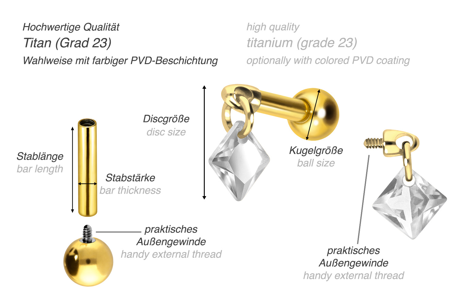 Dieses atemberaubend schöne Ohrpiercing ist aus hochwertigem Titan gefertigt, das auch für Materialeigenschaften wie besonders gute Hautverträglichkeit und hohe Beständigkeit bekannt ist. Ebenfalls zu seinen Vorzügen gehört Farbechtheit, die auch bei den farbigen Varianten mit PVD-Beschichtung gewährleistet wird. Visuell überzeugt das Schmuckstück durch den zeitlos schönen Schraubaufsatz mit Außengewinde in Form eines funkelnden Quadrats. Das Ohrpiercing hat eine Stabstärke von 1,2 mm und ist mit einer Stablänge von entweder 6 oder 8 mm erhältlich. Darüber hinaus können sowohl der Aufsatz als auch die hintere 3 mm Kugel durch das 0,9 mm Innengewinde nach Belieben durch all unsere anderen Schraubaufsätze mit entsprechendem Außengewinde ausgetauscht werden.