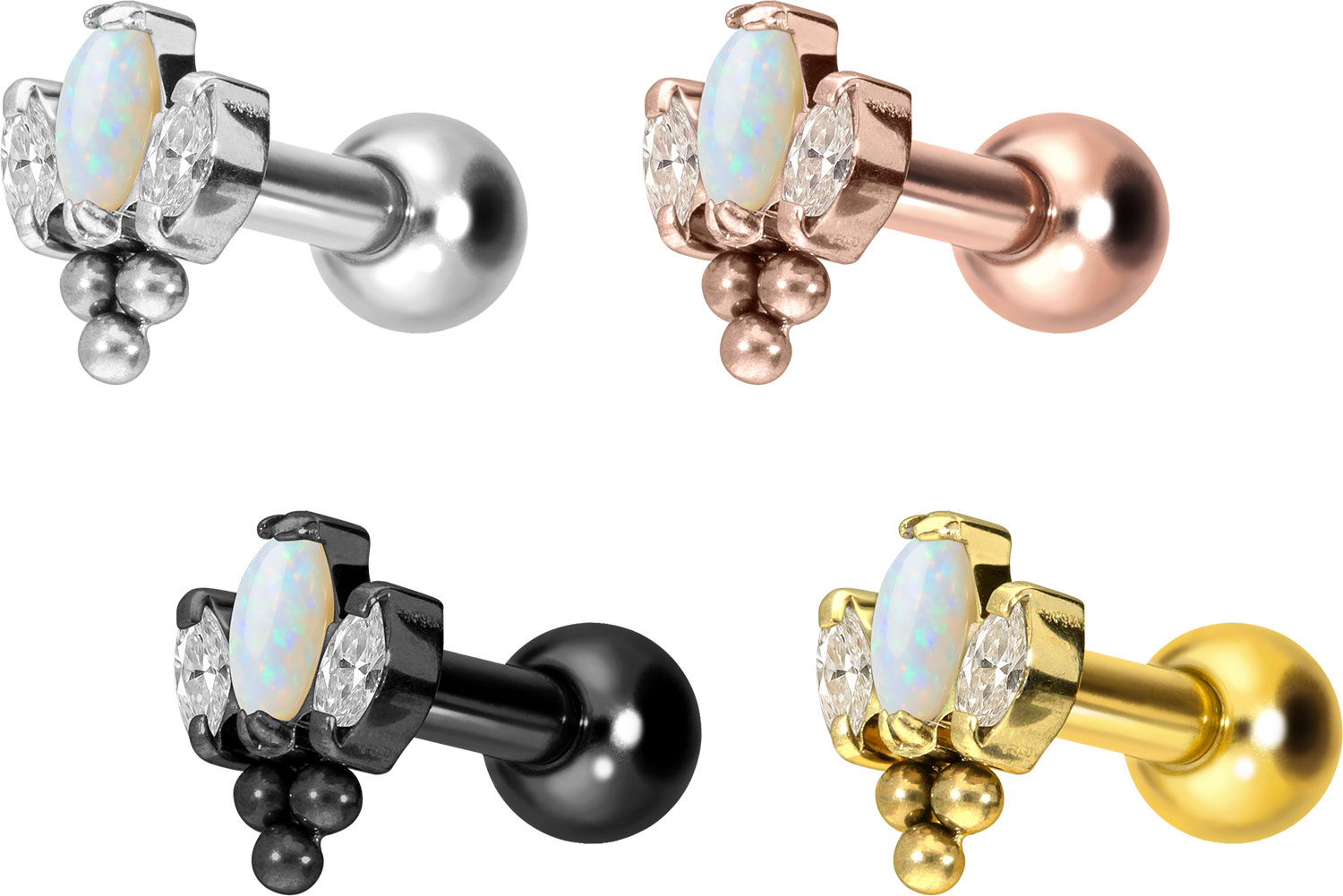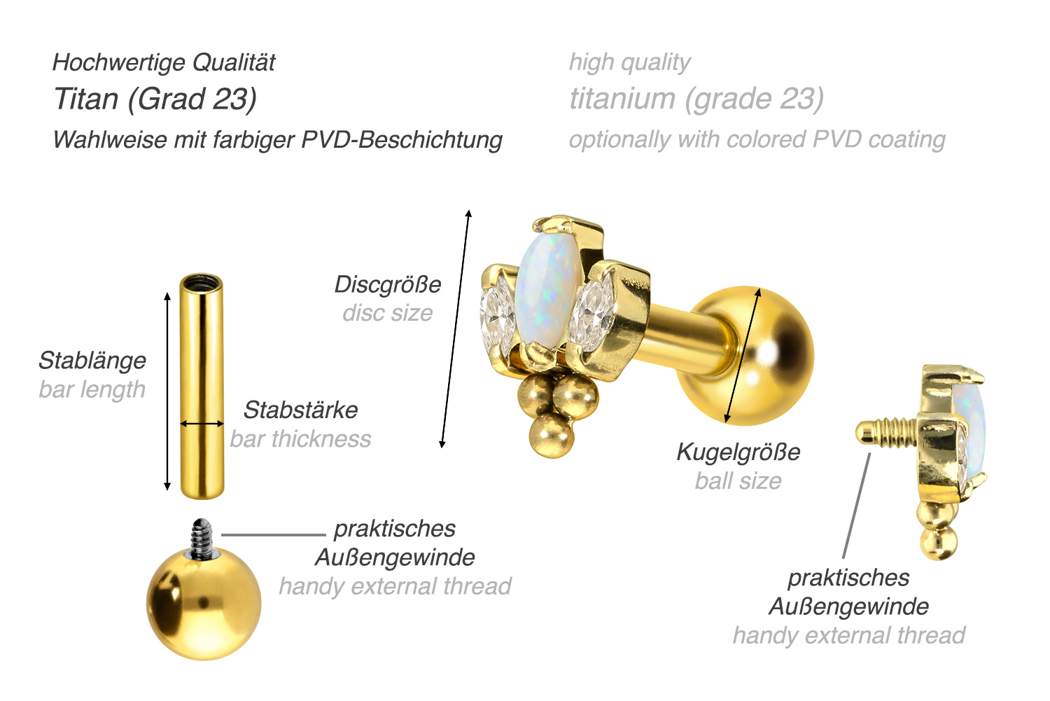 Dieses atemberaubend schöne Ohrpiercing ist aus hochwertigem Titan gefertigt, das auch für Materialeigenschaften wie besonders gute Hautverträglichkeit und hohe Beständigkeit bekannt ist. Ebenfalls zu seinen Vorzügen gehört Farbechtheit, die auch bei den farbigen Varianten mit PVD-Beschichtung gewährleistet wird. Visuell überzeugt das Schmuckstück durch den zeitlos schönen Schraubaufsatz mit Außengewinde in Form einer Lotusblüte, die sich aus mehreren funkelden Kristallen und einem synthetischen Opal zusammensetzt und zusätzlich mit drei Kugeln verziehrt ist. Das Ohrpiercing hat eine Stabstärke von 1,2 mm und ist mit einer Stablänge von entweder 6 oder 8 mm erhältlich. Darüber hinaus können sowohl der Aufsatz als auch die hintere 3 mm Kugel durch das 0,9 mm Innengewinde nach Belieben durch all unsere anderen Schraubaufsätze mit entsprechendem Außengewinde ausgetauscht werden.