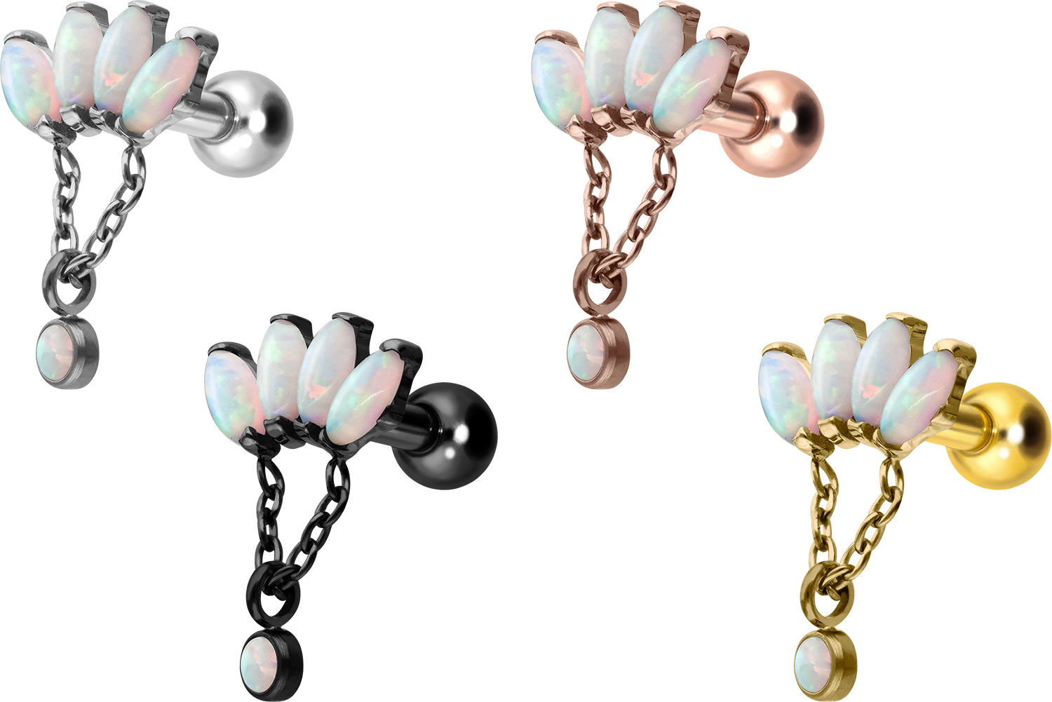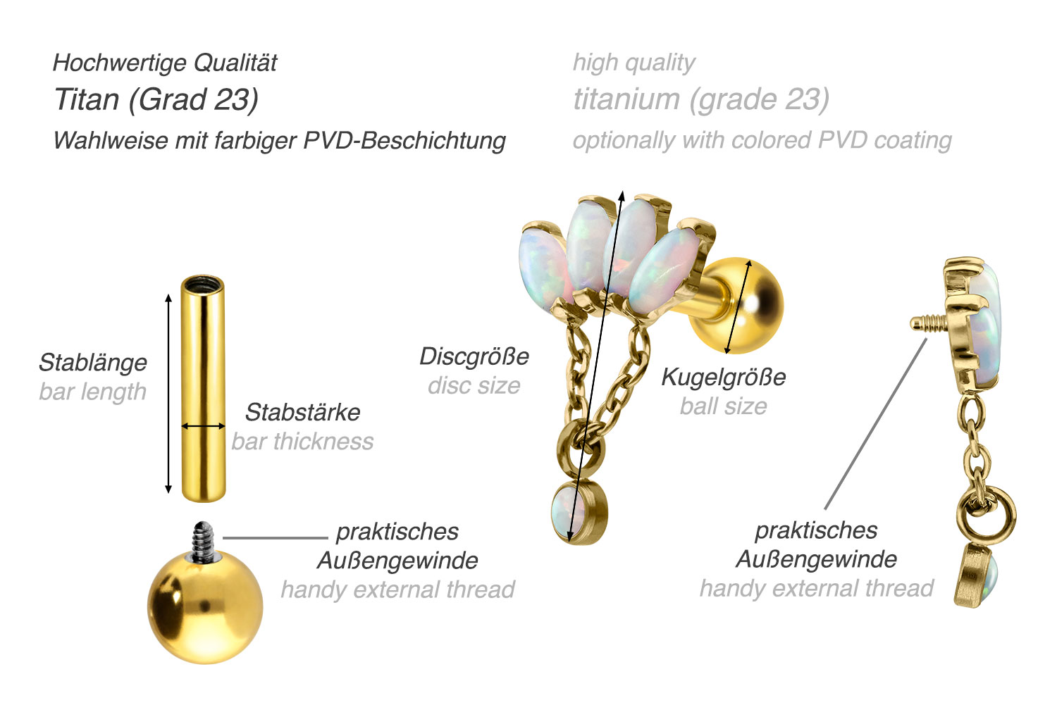 Dieses atemberaubend schöne Ohrpiercing ist aus hochwertigem Titan gefertigt, das auch für Materialeigenschaften wie besonders gute Hautverträglichkeit und hohe Beständigkeit bekannt ist. Ebenfalls zu seinen Vorzügen gehört Farbechtheit, die auch bei den farbigen Varianten mit PVD-Beschichtung gewährleistet wird. Visuell überzeugt das Schmuckstück durch den zeitlos schönen Schraubaufsatz mit Außengewinde in Form einer Lotusblüte, an welcher eine Kette mit einem synthetischen Opal befestigt ist. Das Ohrpiercing hat eine Stabstärke von 1,2 mm und ist mit einer Stablänge von entweder 6 oder 8 mm erhältlich. Darüber hinaus können sowohl der Aufsatz als auch die hintere 3 mm Kugel durch das 0,9 mm Innengewinde nach Belieben durch all unsere anderen Schraubaufsätze mit entsprechendem Außengewinde ausgetauscht werden.