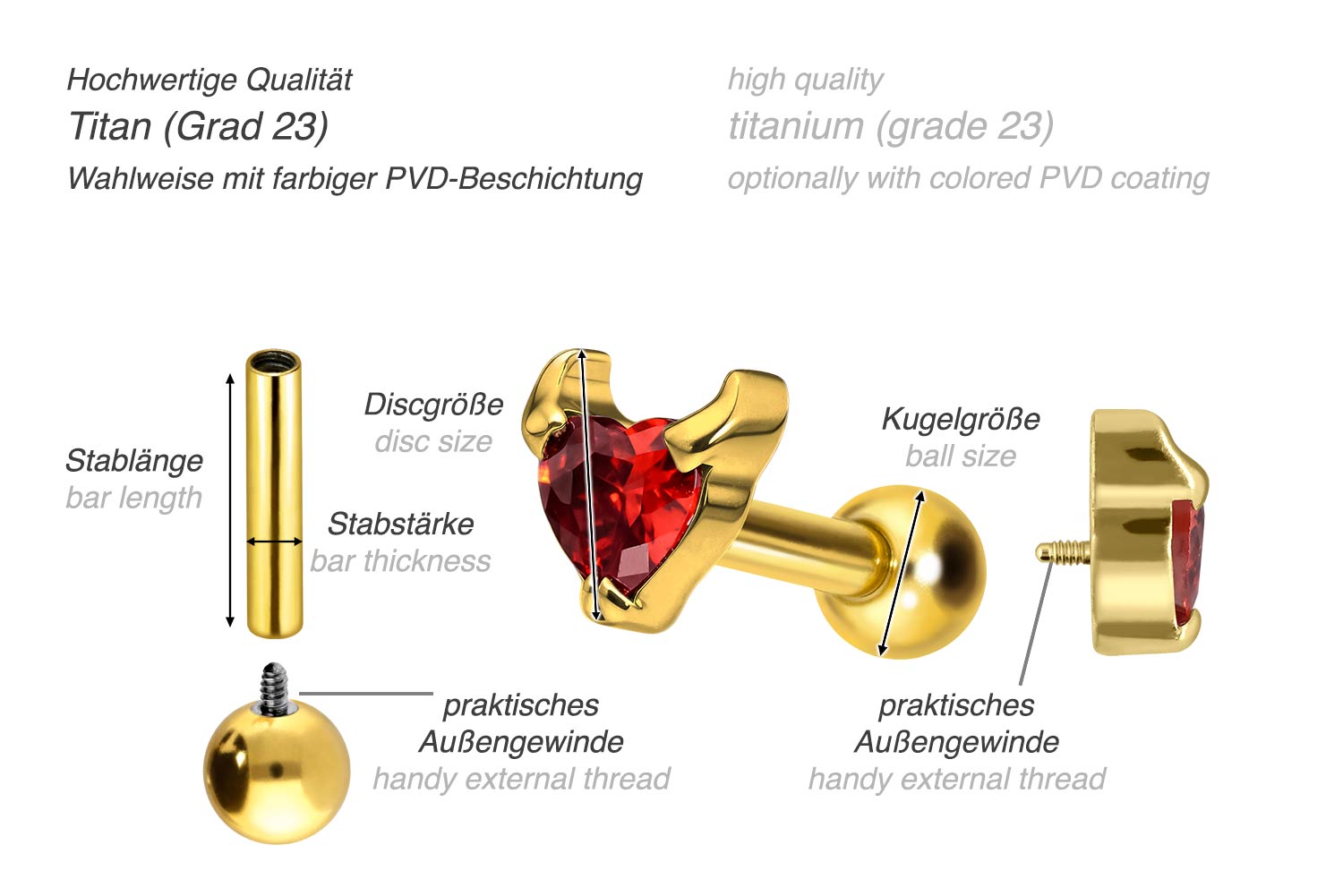 Dieses atemberaubend schöne Ohrpiercing ist aus hochwertigem Titan gefertigt, das auch für Materialeigenschaften wie besonders gute Hautverträglichkeit und hohe Beständigkeit bekannt ist. Ebenfalls zu seinen Vorzügen gehört Farbechtheit, die auch bei den farbigen Varianten mit PVD-Beschichtung gewährleistet wird. Visuell überzeugt das Schmuckstück durch den zeitlos schönen Schraubaufsatz mit Außengewinde in Form eines Teufelsherzens. Das Ohrpiercing hat eine Stabstärke von 1,2 mm und ist mit einer Stablänge von entweder 6 oder 8 mm erhältlich. Darüber hinaus können sowohl der Aufsatz als auch die hintere 3 mm Kugel durch das 0,9 mm Innengewinde nach Belieben durch all unsere anderen Schraubaufsätze mit entsprechendem Außengewinde ausgetauscht werden.