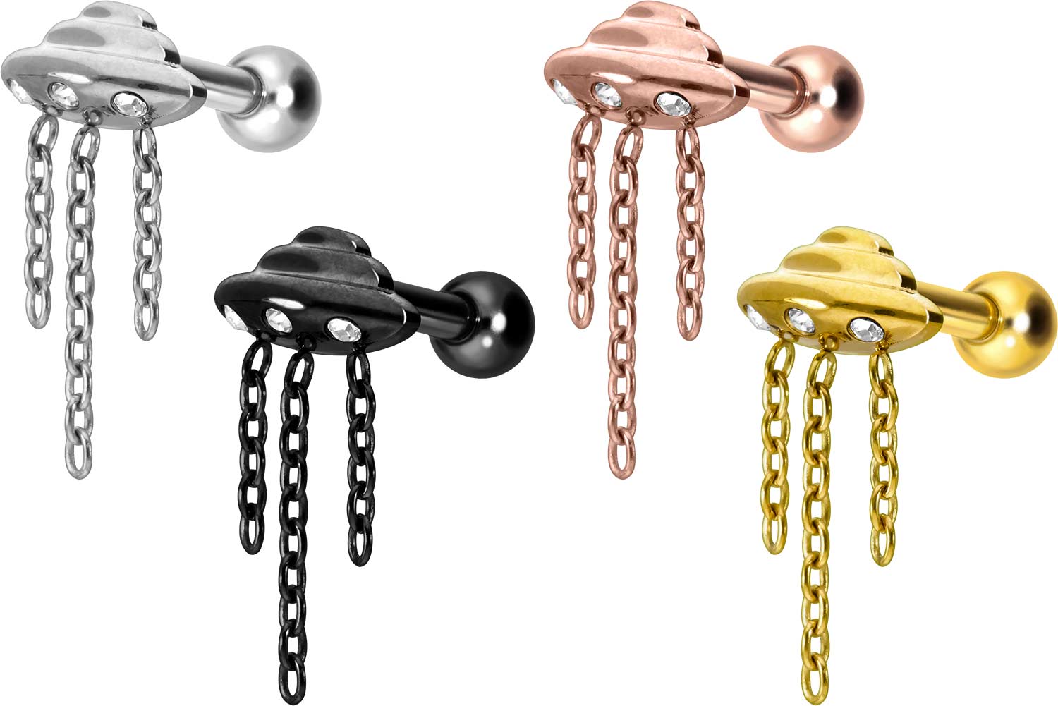 PVD-Beschichtung gewährleistet wird. Visuell überzeugt das Schmuckstück durch den zeitlos schönen Schraubaufsatz mit Außengewinde in Form eines Ufos, an welchem mehrere Ketten angebracht sind. Das Ohrpiercing hat eine Stabstärke von 1,2 mm und ist mit einer Stablänge von entweder 6 oder 8 mm erhältlich. Darüber hinaus können sowohl der Aufsatz als auch die hintere 3 mm Kugel durch das 0,9 mm Innengewinde nach Belieben durch all unsere anderen Schraubaufsätze mit entsprechendem Außengewinde ausgetauscht werden.