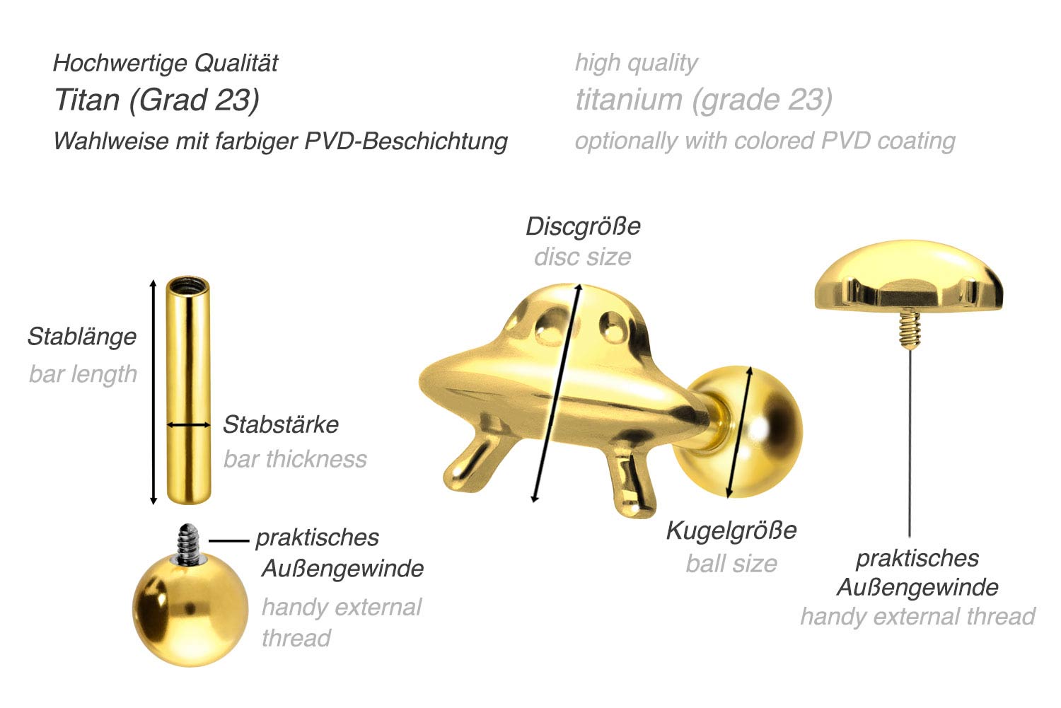 PVD-Beschichtung gewährleistet wird. Visuell überzeugt das Schmuckstück durch den zeitlos schönen Schraubaufsatz mit Außengewinde in Form eines Ufos. Das Ohrpiercing hat eine Stabstärke von 1,2 mm und ist mit einer Stablänge von entweder 6 oder 8 mm erhältlich. Darüber hinaus können sowohl der Aufsatz als auch die hintere 3 mm Kugel durch das 0,9 mm Innengewinde nach Belieben durch all unsere anderen Schraubaufsätze mit entsprechendem Außengewinde ausgetauscht werden.