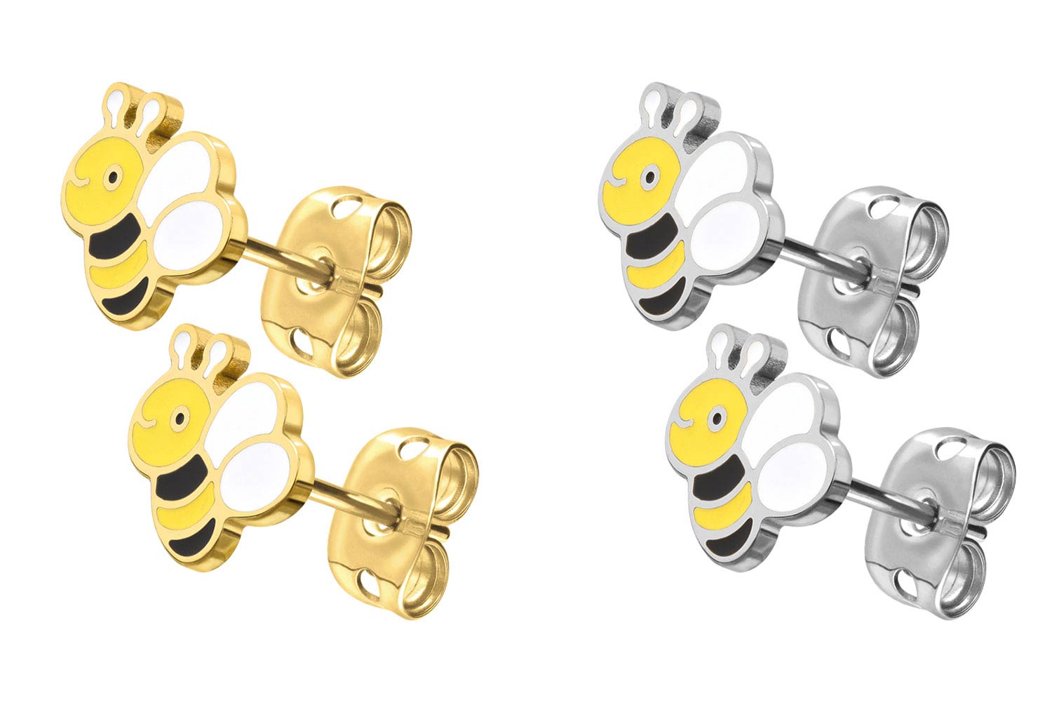 Diese zeitlos schönen Ohrstecker bestehen aus hochwertigem Titan, das sich unter anderem durch gute Hautverträglichkeit und hohe Beständigkeit auszeichnet. Ebenfalls zu seinen spezifischen Materialeigenschaften gehört Farbechtheit, die auch bei den Varianten mit goldfarbener PVD-Beschichtung gewährleistet wird. Das Design in Form einer Biene, das sich an den vorderen Enden der Stecker befindet, ist aufgrund der Gestaltung besonders für Kinder ansprechend. Sie werden darüber hinaus, wie abgebildet, paarweise geliefert.
