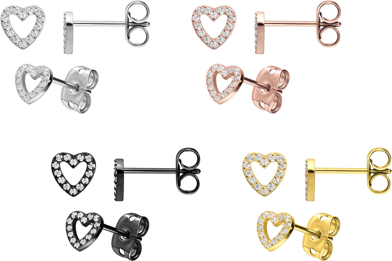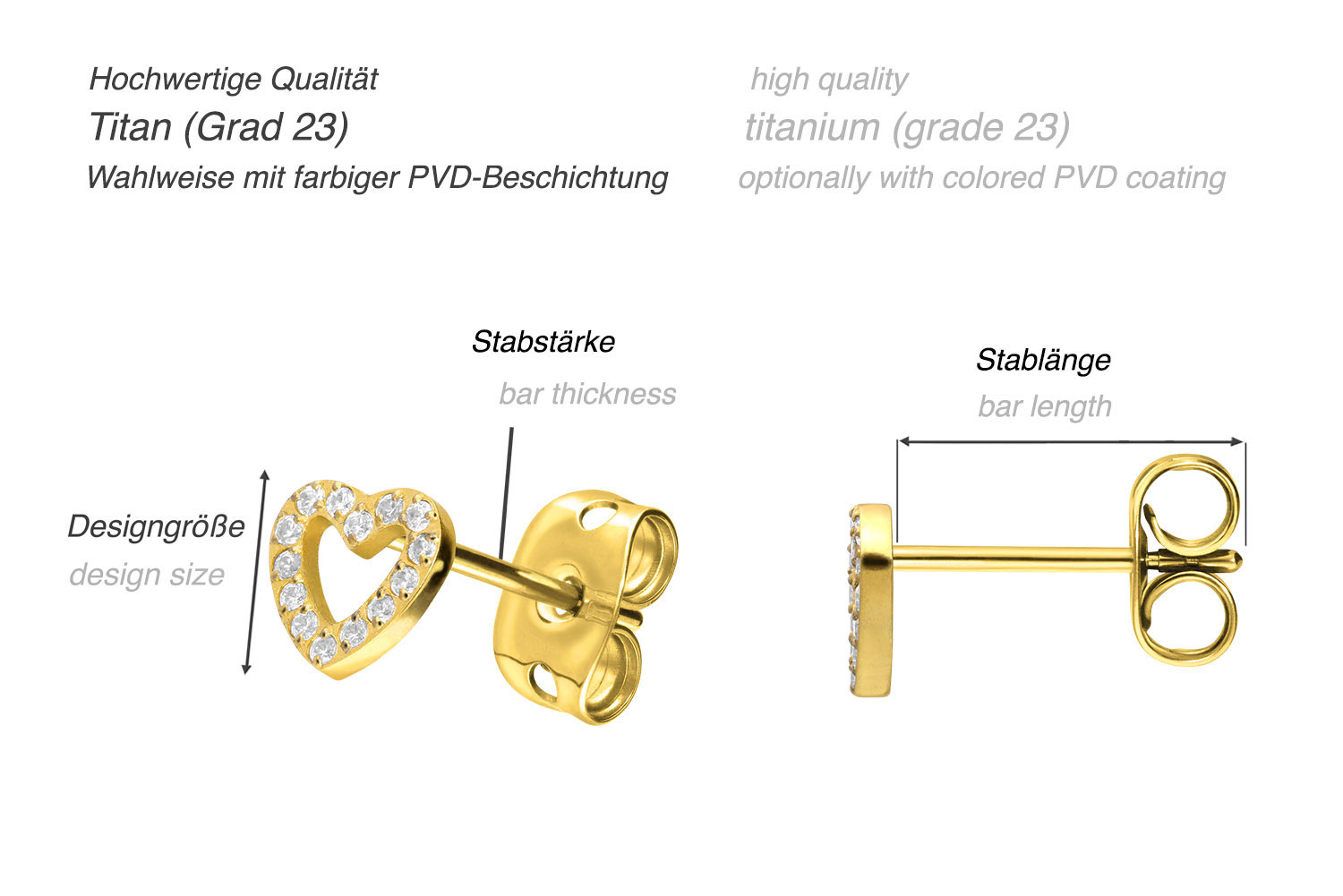 Diese zeitlos schönen Ohrstecker bestehen aus hochwertigem Titan, das sich unter anderem durch gute Hautverträglichkeit und hohe Beständigkeit auszeichnet. Ebenfalls zu seinen spezifischen Materialeigenschaften gehört Farbechtheit, die auch bei den Varianten mit PVD-Beschichtung gewährleistet wird. Beide Stecker sind mit je einem Herzen, welches mit eingefassten Kristallen verziert ist, versehen und erstrahlen so in voller Pracht. Sie werden darüber hinaus wie abgebildet paarweise geliefert.