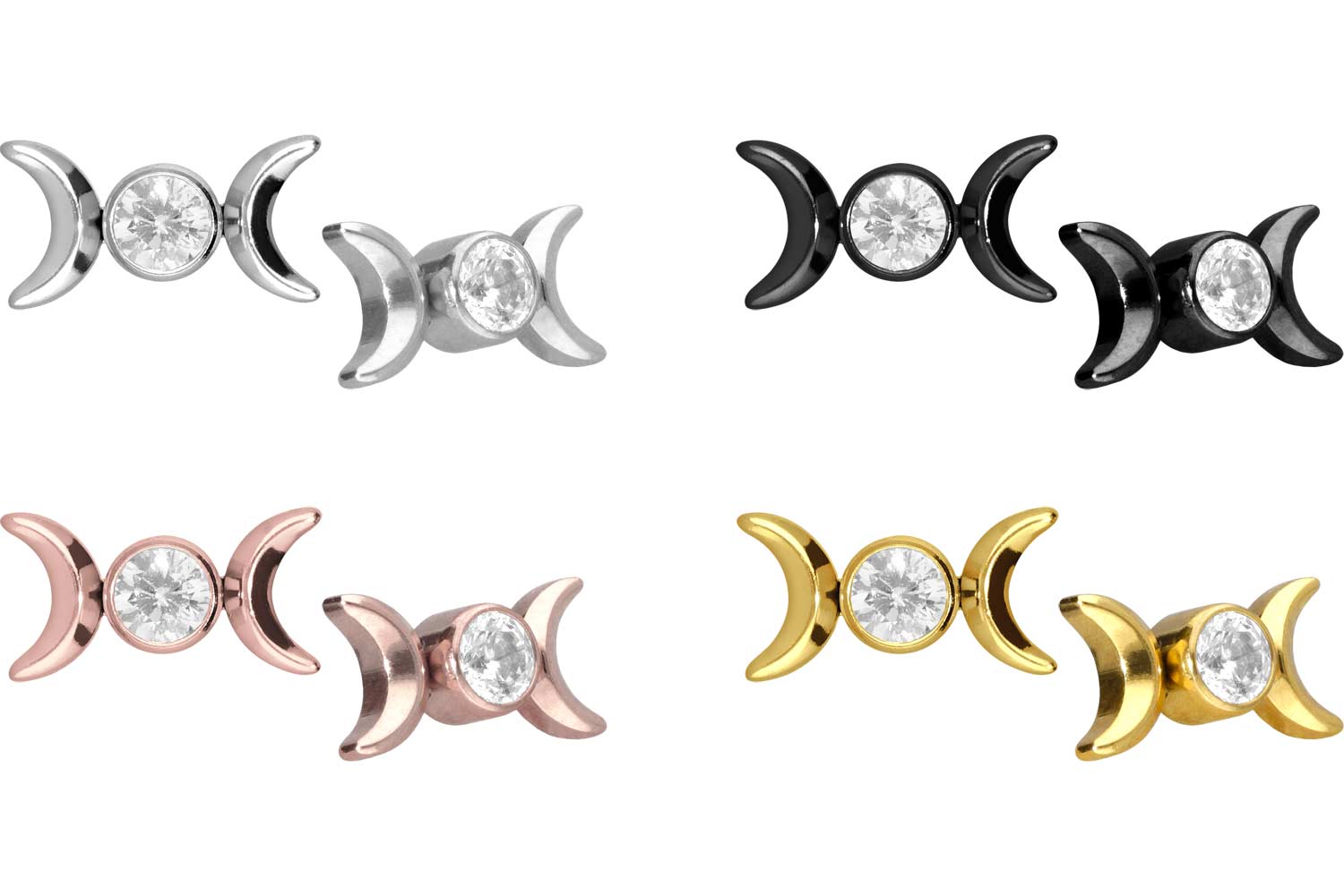 Dieser zeitlos schöne Schraubaufsatz in Form von zwei Monden, welche durch einen funkelnden Kristall miteinander verbunden sind, wurde speziell für unsere Innengewinde-Piercings entwickelt und besteht aus