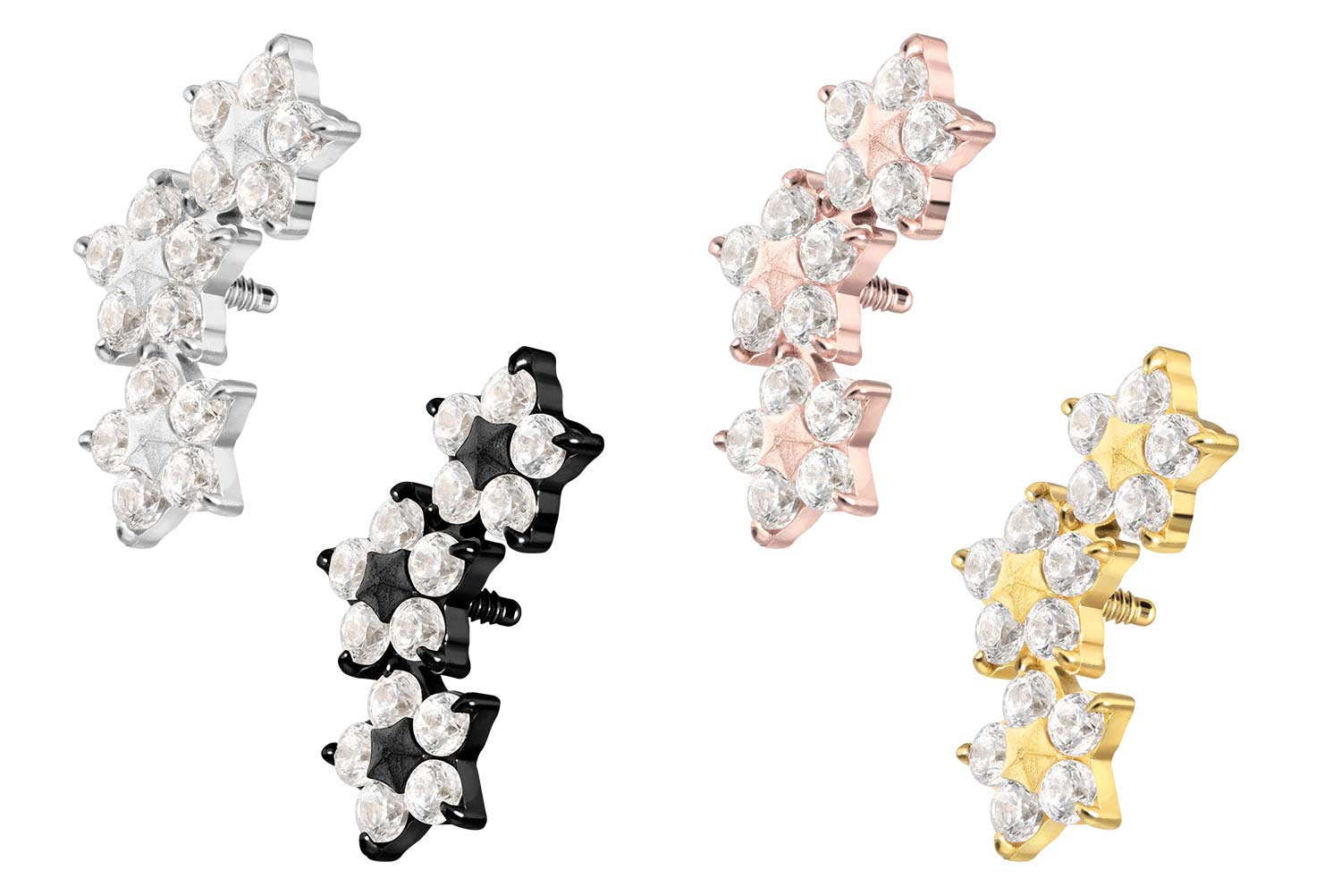 Dieser zeitlos schöne Schraubaufsatz in Form von drei Kristallblumen wurde speziell für unsere Innengewinde-Piercings entwickelt und besteht aus hochwertigem Titan, das sich unter anderem durch gute Hautverträglichkeit und hohe Beständigkeit auszeichnet. Ebenfalls zu seinen spezifischen Materialeigenschaften gehört Farbechtheit, die sowohl bei der silberfarbenen als auch bei der schwarzen, gold- und roségoldfarbenen Variante mit PVD-Beschichtung gewährleistet wird. Das 0,9 mm starke Außengewinde des Aufsatzes ist mit all unseren Produkten, die über ein solches Innengewinde verfügen, kompatibel, sodass sich vielfältige Kombinationsmöglichkeiten ergeben.