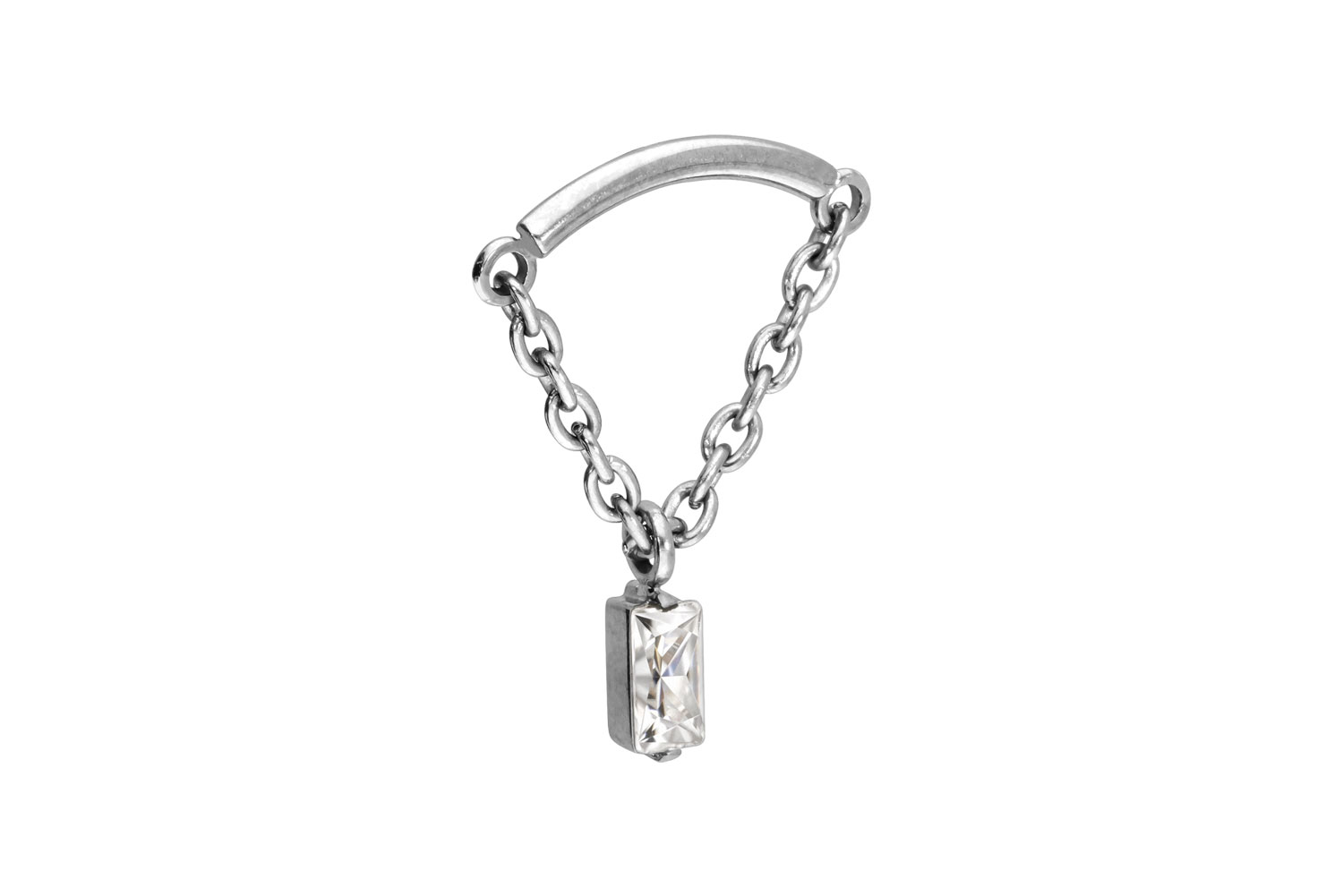 Dieser zeitlos schöne Schraubaufsatz in Form eines Bogens, an welchem eine Kette mit einem beweglichen Kristallrechteck befestigt ist, wurde speziell für unsere Innengewinde-Piercings