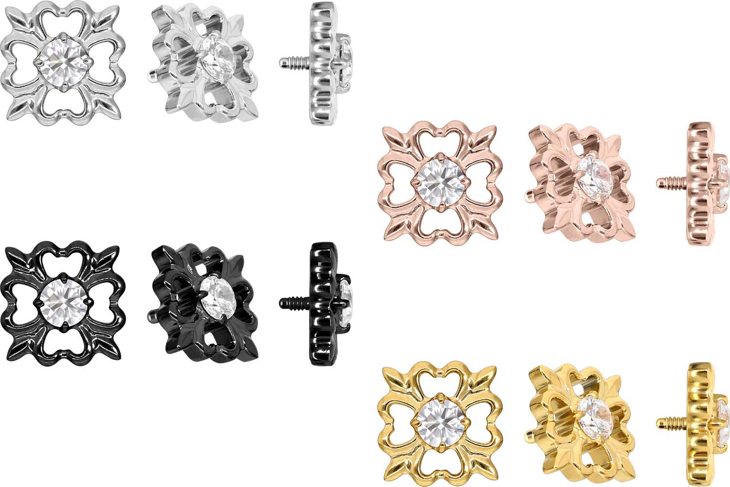 Dieser zeitlos schöne Schraubaufsatz in Form eines Kleeblattes wurde speziell für unsere Innengewinde-Piercings entwickelt und besteht aus hochwertigem Titan, das sich unter anderem durch gute Hautverträglichkeit und hohe Beständigkeit auszeichnet. Ebenfalls zu seinen spezifischen Materialeigenschaften gehört Farbechtheit, die sowohl bei der silberfarbenen als auch bei der schwarzen, gold- und roségoldfarbenen Variante mit PVD-Beschichtung gewährleistet wird. Das 0,9 mm starke Außengewinde des Aufsatzes ist mit all unseren Produkten, die über ein solches Innengewinde verfügen, kompatibel, sodass sich vielfältige Kombinationsmöglichkeiten ergeben.