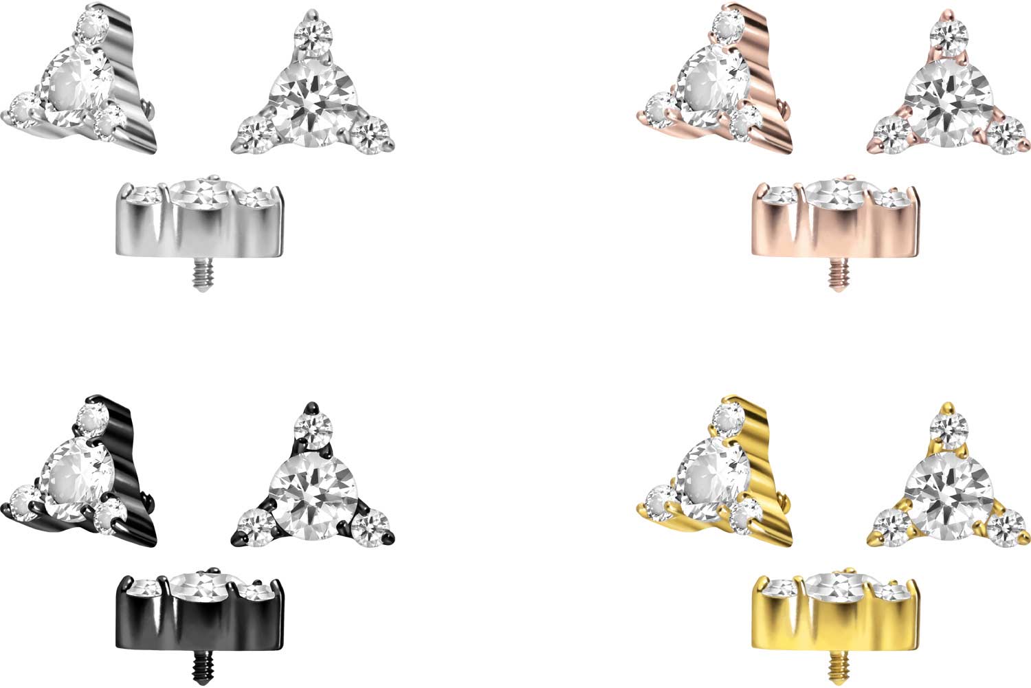 Dieser zeitlos schöne Schraubaufsatz in Form eines Dreiecks, bestehend aus insgesamt vier Kristallen, wurde speziell für unsere Innengewinde-Piercings entwickelt und besteht aus