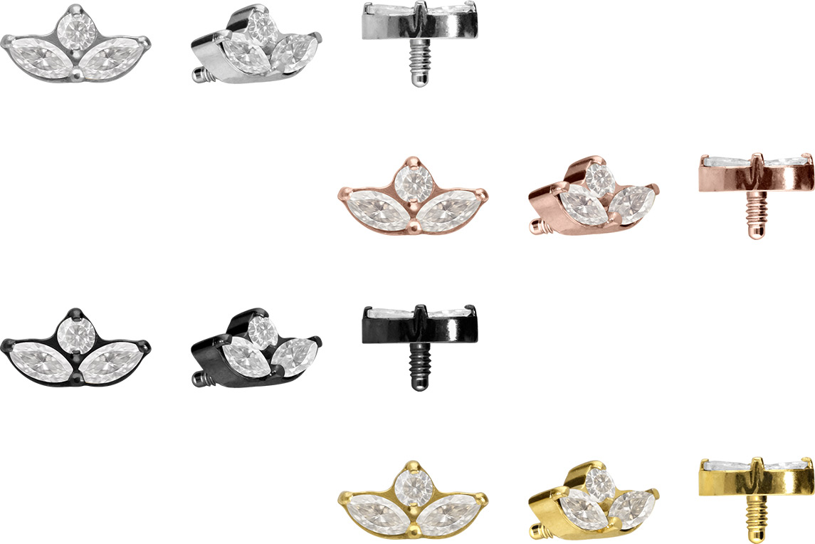 Dieser zeitlos schöne Schraubaufsatz in Form einer Lotusblüte, die sich aus mehreren funkelnden Kristallen zusammensetzt, wurde speziell für unsere Innengewinde-Piercings entwickelt und besteht aus