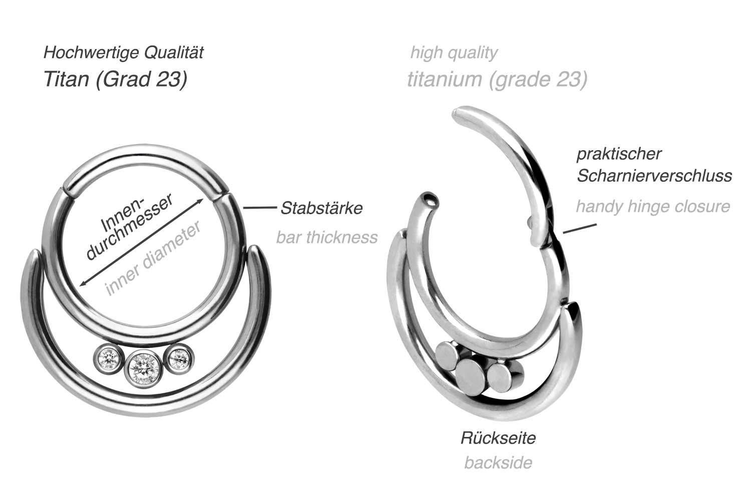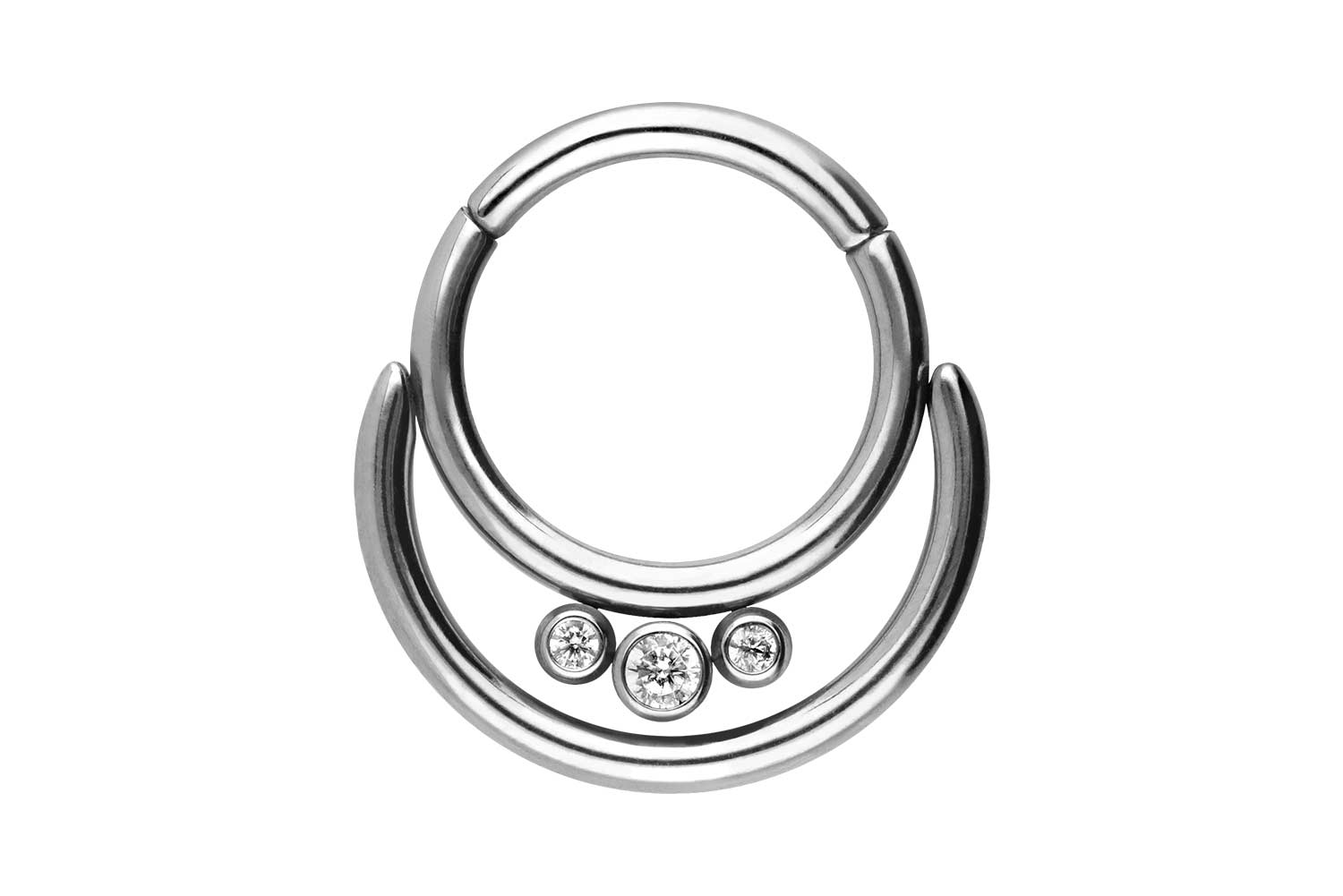 Einfache Handhabung und schönes Design – das sind unsere Clicker! Als Hauptmerkmal der Clicker zählt das praktische Scharnier, das den Einsatz in den Stichkanal enorm erleichtert. Das zur Herstellung verwendete Material (Titan Grad 23) zeichnet sich insbesondere durch gute Hautverträglichkeit, hochwertige Qualität und hohe Beständigkeit aus. Die drei wunderschön funkelnden Kristalle sind in Verbindung mit den zwei Ringen ein echter Hingucker. Ob am Ohr, der Nase, oder der Lippe – unsere Clicker sind für die verschiedensten Piercingstellen geeignet. Dieser Clicker ist mit einer Stabstärke von 1,2 mm und einem Innendurchmesser von 8 mm erhältlich.