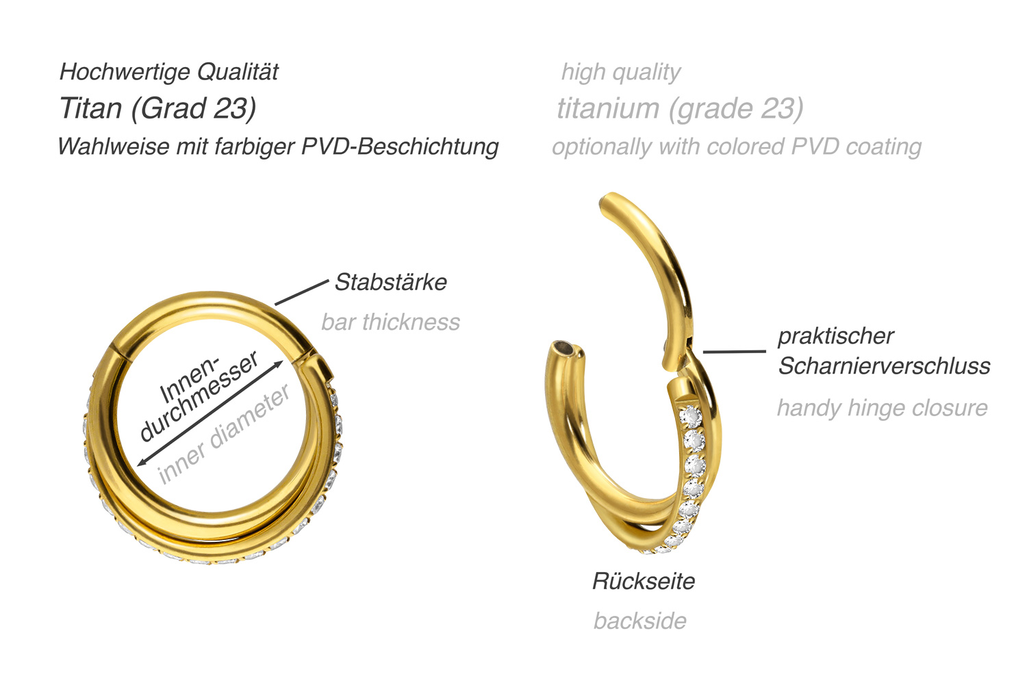 Einfache Handhabung und schönes Design - das sind unsere Clicker! Als Hauptmerkmal der Clicker zählt das praktische Scharnier, das den Einsatz in den Stichkanal enorm erleichtert. Das zur Herstellung verwendete Material (Titan Grad 23) zeichnet sich insbesondere durch gute Hautverträglichkeit, hochwertige Qualität und hohe Beständigkeit aus. Je nach Farbwunsch ist das Piercing mit einer kratzfesten PVD-Beschichtung überzogen. Besonders gelungen ist das außergewöhnliche Design, welches aus zwei überkreuzten Ringen besteht. Zusätzlich ist einer der Ringe mit funkelnden Kristallen versehen. Ob am Ohr, der Nase, oder der Lippe - unsere Clicker sind für die verschiedensten Piercingstellen geeignet. Dieser Clicker ist in den unten aufgeführten Stabstärken und Innendurchmessern erhältlich.