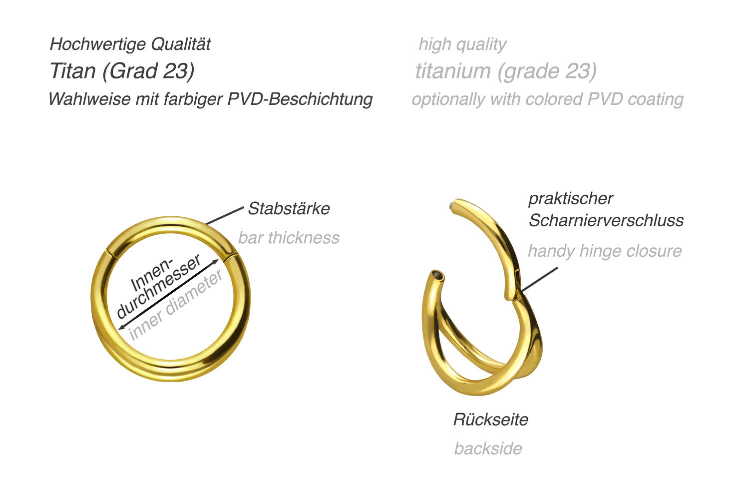 das Piercing mit einer kratzfesten PVD-Beschichtung überzogen. Besonders aufwendig und damit ebenso beeindruckend sind die zwei Ringe. Ob am Ohr, der Nase, oder der Lippe - unsere Clicker sind für die verschiedensten Piercingstellen geeignet. Dieser Clicker ist in den unten aufgeführten Stabstärken und Innendurchmessern erhältlich.