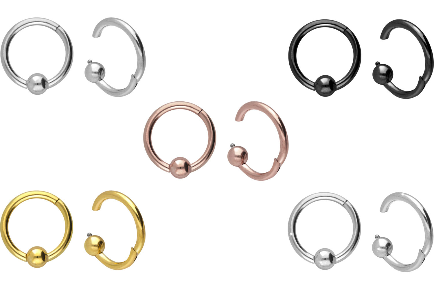 Einfache Handhabung und schönes Design - das sind unsere Clicker! Als Hauptmerkmal der Clicker zählt das praktische Scharnier, das den Einsatz in den Stichkanal enorm erleichtert. Das zur Herstellung verwendete Material (Titan Grade 23) zeichnet sich insbesondere durch gute Hautverträglichkeit, hohe Qualität und hohe Beständigkeit aus. Je nach Farbwunsch ist das Piercing mit einer kratzfesten PVD-Beschichtung überzogen. Besonders hervorzuheben ist die weißgoldfarbene PVD-Beschichtung, die dem Clicker einen hellen silbrigen Glanz verleiht. Das clever platzierte Scharnier ermöglicht es, den Clicker nahtlos zu schließen. Abgerundet wird das edle Design durch die Kugel. Ob am Ohr, an der Nase oder an der Lippe - unsere Clicker sind für die verschiedensten Piercingstellen geeignet. Die Stabstärke beträgt immer 1,2 mm, wohingegen die verfügbaren Innendurchmesser unten aufgeführt sind.