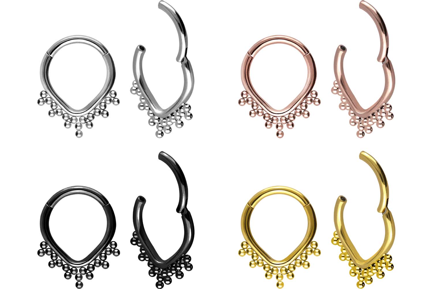 Einfache Handhabung und schönes Design - das sind unsere Clicker! Als Hauptmerkmal der Clicker zählt das praktische Scharnier, das den Einsatz in den Stichkanal enorm erleichtert. Das zur Herstellung verwendete Material (Titan Grad 23) zeichnet sich insbesondere durch gute Hautverträglichkeit, hochwertige Qualität und hohe Beständigkeit aus. Je nach Farbwunsch ist das Piercing mit einer kratzfesten PVD-Beschichtung überzogen. Besonders gelungen ist die stilvolle Anordnung der Kugeln um die außergewöhnliche Tropfenform des Schmuckstücks. Ob am Ohr, der Nase, oder der Lippe - unsere Clicker sind für die verschiedensten Piercingstellen geeignet.