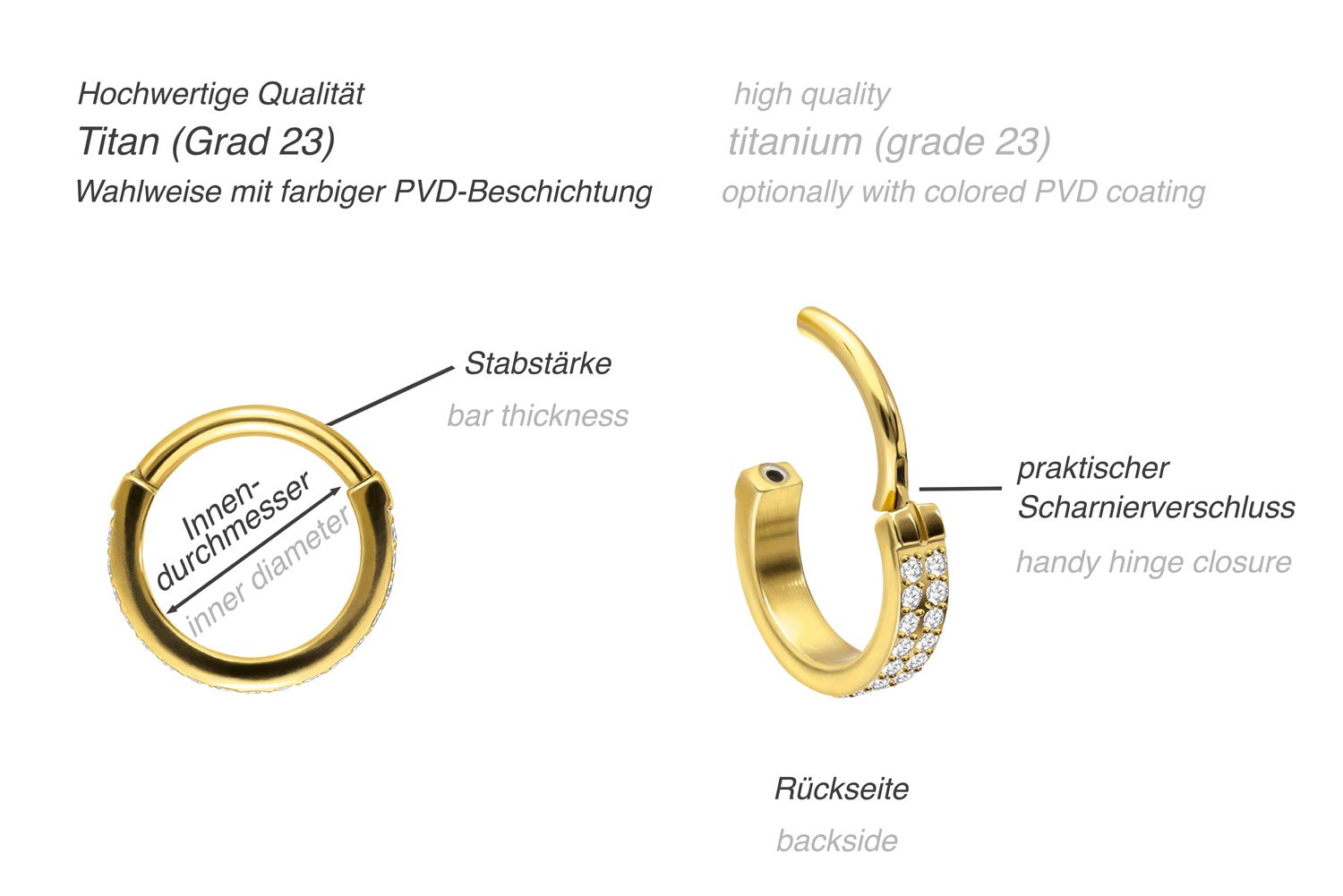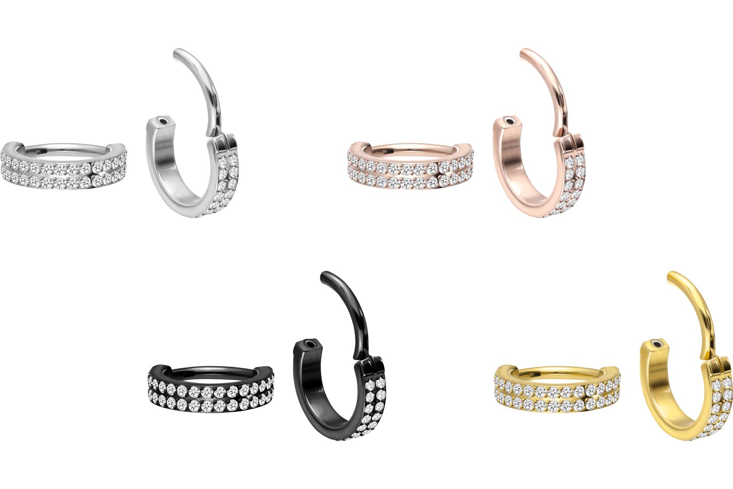 das Piercing mit einer kratzfesten PVD-Beschichtung überzogen. Besonders aufwendig und damit ebenso beeindruckend ist das stilvolle Design des Schmuckstücks, das über zwei mit funkelnden Kristallen besetzte Reihen verfügt. Ob am Ohr, der Nase, oder der Lippe - unsere Clicker sind für die verschiedensten Piercingstellen geeignet. Dieser Clicker ist mit einer Stabstärke von 1,2 mm in den unten aufgeführten Innendurchmessern erhältlich.
