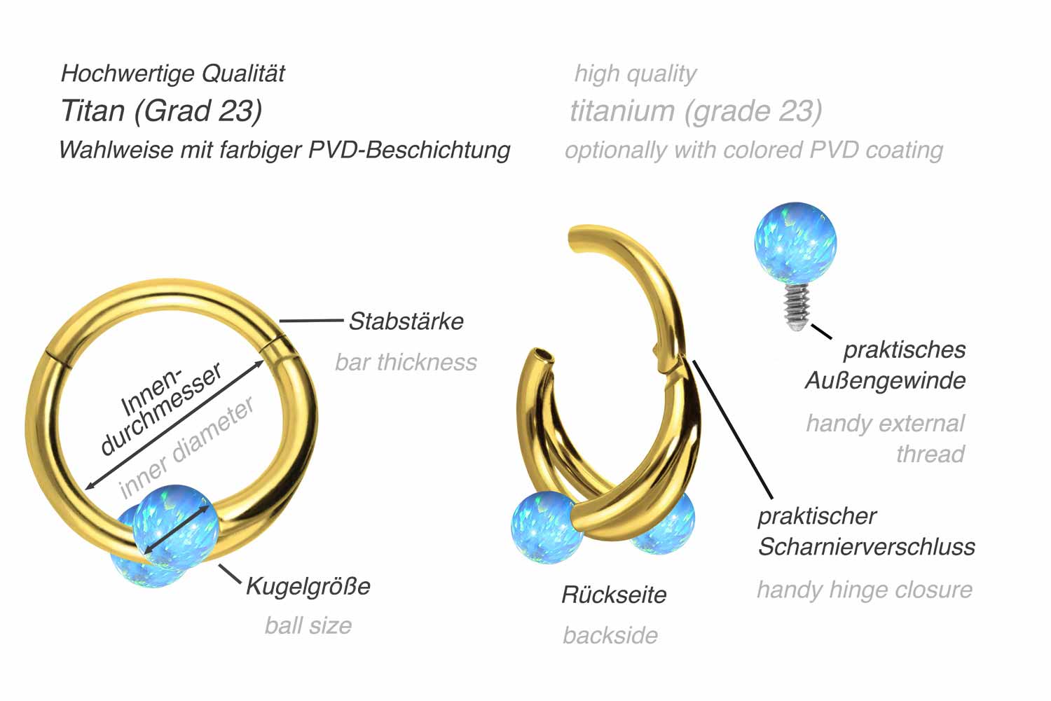 zudem über ein 0,9 mm starkes Innengewinde, passend zu den Außengewinden der daran angebrachten synthetischen Opale. Ob am Ohr, der Nase,